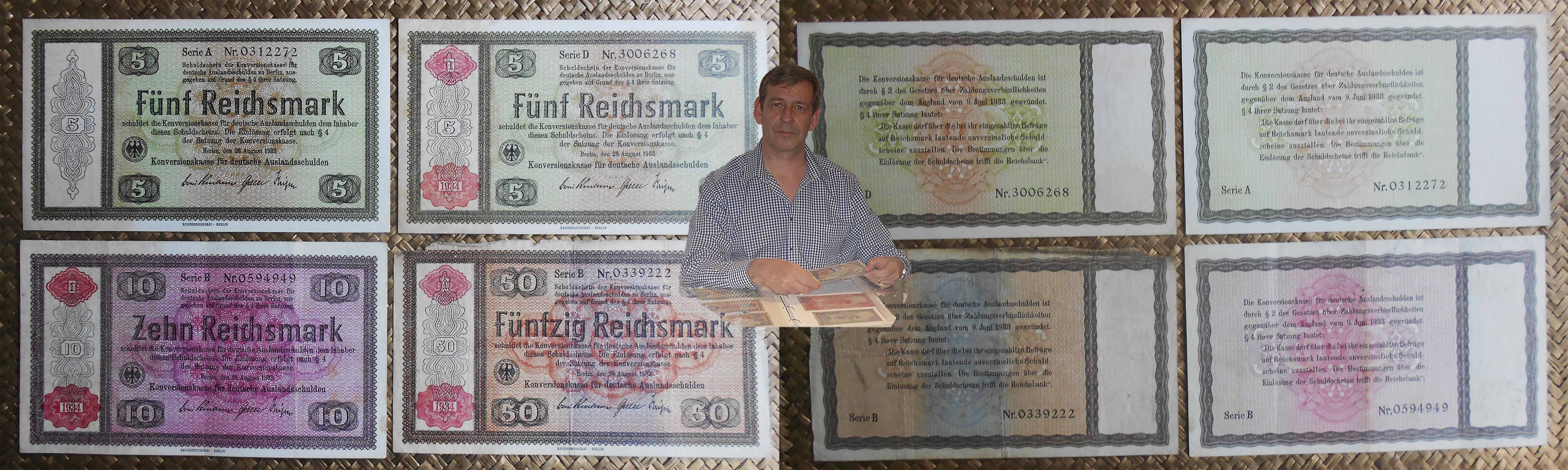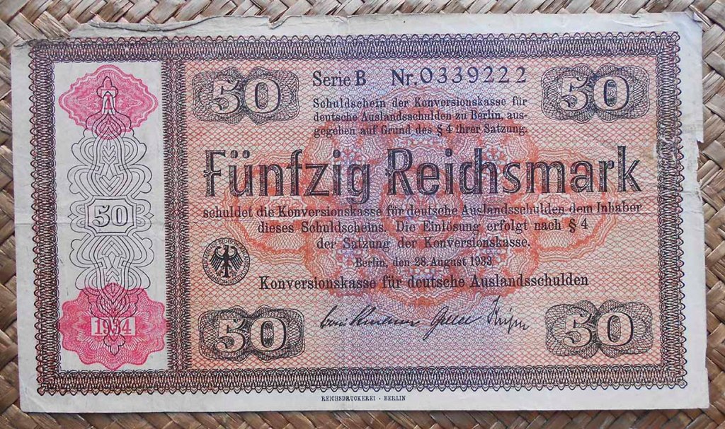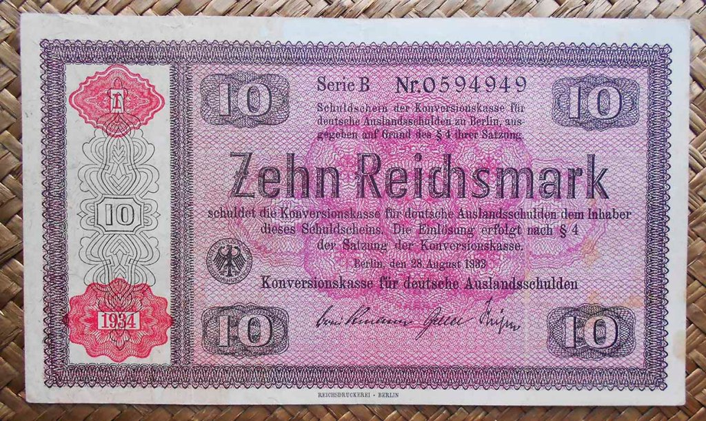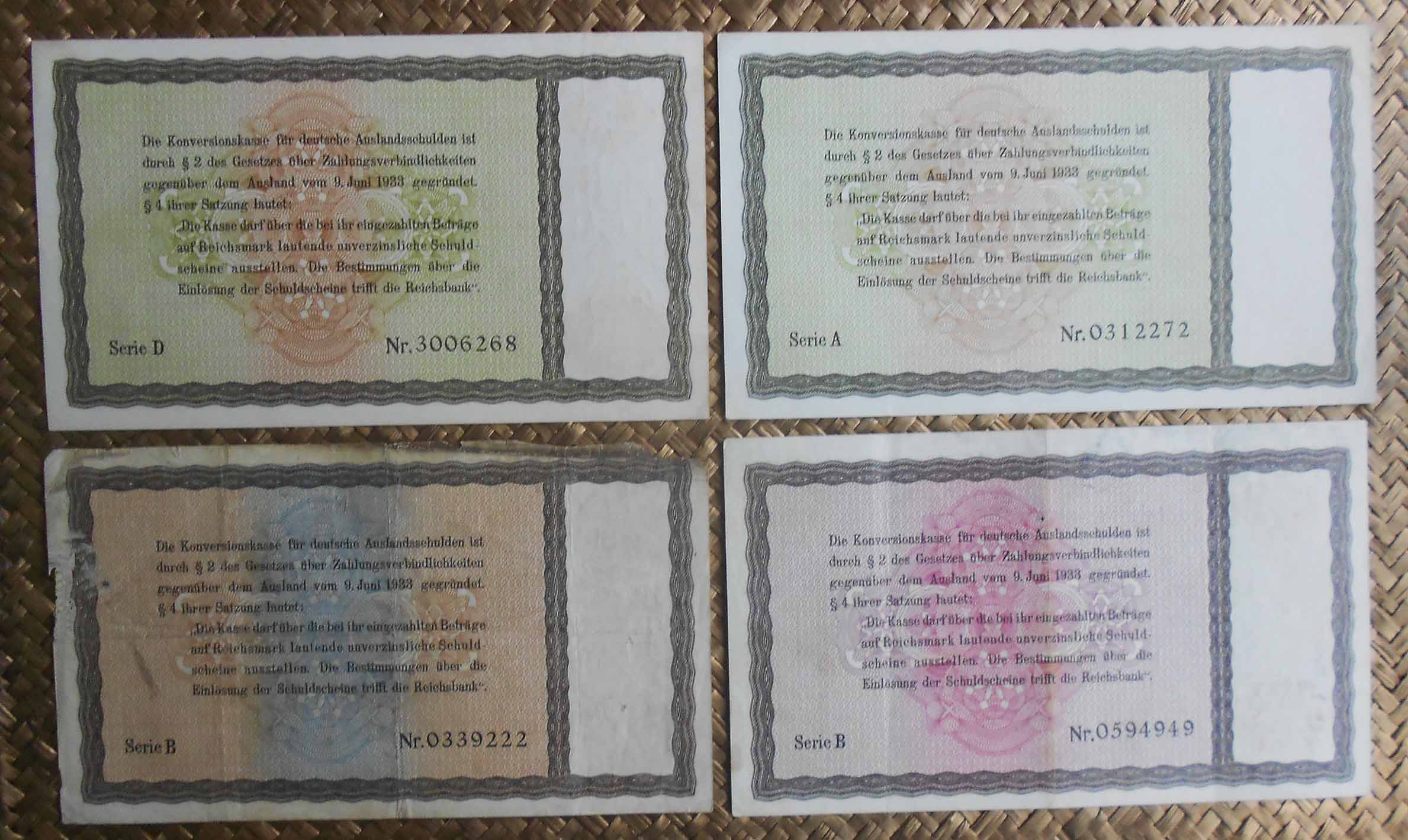 Coetáneamente al nombramiento de Adolf Hitler como canciller de Alemania, en 1933, verían la luz unos peculiares billetes pagarés que iban a formar parte de los fondos de conversión para la deuda externa alemana. Esta especie de certificados de deuda externa fueron emitidos por el Reichsbank, que en esa fecha aún era una institución independiente del gobierno del Tercer Reich. Estas notas se emitieron de 1933 a 1935 para refugiados predominantemente judíos, que recibían estos billetes como pago por las propiedades que les confiscaban.
