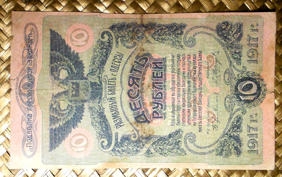 El billete de 3 rublos de Odessa de 1917 nos deleita con un águila bicéfala sujetando con sus garras el escudo de armas de la Odessa imperial (aunque más bien pareciese dos águilas siamesas con un único par de alas en intención de levantar el vuelo). A su lado la antigua Bolsa de la ciudad (ahora sede del Teatro Filarmónico de Odessa). Todo ello en el interior de un marco de lazos y ramas de laurel y frutos que cierran el anverso con un medallón con la cabeza de un Mercurio con casco alado en la esquina inferior derecha. Cromaticidad verdosa y negra con número de serie en azul en el lateral derecho.