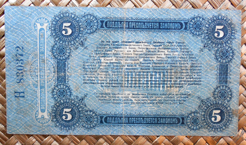 El billete de 5 rublos de Odessa de 1917 es muy semejante al anterior. Solo cambia la impresión en el lateral izquierdo, y en vertical, del valor y un nuevo valedor del billete con su firma, pasando la numeración de serie, también en azul, al reverso. Cromaticidad azulada y reverso con la misma composición anterior, salvo el valor, que cambia.