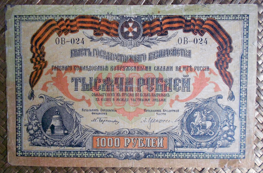 Desde “Miscelánea” seguimos en los tiempos de la Revolución Rusa, para repasar un billetario emitido para uno de esos generales del bando contrarrevolucionario o tropas del ejército blanco. Militares que pertenecieron mayoritariamente a los ejércitos zaristas en la época del Imperio (Kolchak, Yudenich, Miller, Denikin, Kornilov, Wrangel, Krasnov, …). Esta vez revisaremos la serie de rublos de 1919 para los territorios de Rusia del Sur bajo el mando del General Wrangel.