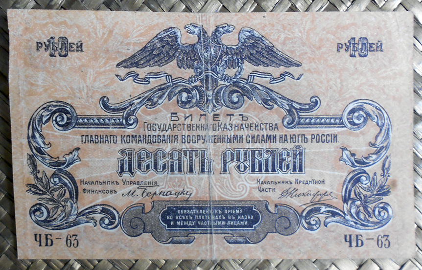 El billete de 10 rublos de Rusia del Sur de 1919 – Gral. Wrangel nos ofrece en su anverso una composición de grecas florales formando un marco sobre el que se posa el águila bicéfala que sujeta una cinta con sus garras y lleva en su pecho un blasón con San Jorge y el dragón. Textos en ruso y nºs de serie en tipografía negra. Cromaticidad anaranjada con grabados en negro.