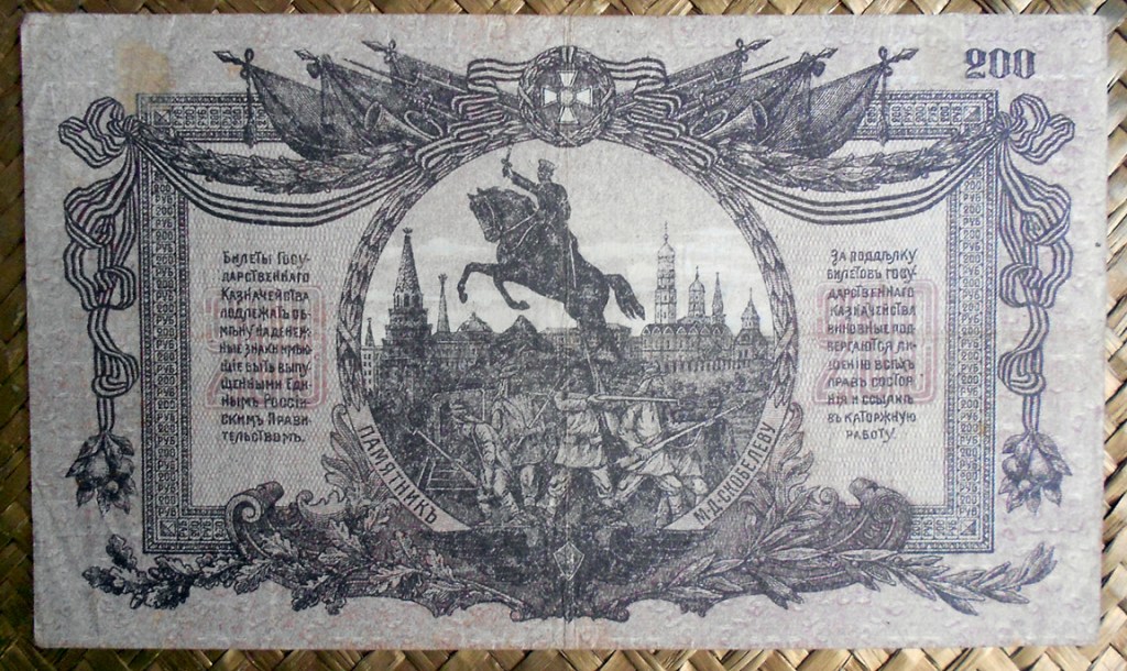 El billete de 200 rublos de Rusia del Sur de 1919 – Gral. Wrangel nos muestra al anverso una barroca composición al puro estilo imperial, presidida por el águla bicéfala (sin corona) con San Jorge en su pecho. Al pie vuelve a representarse a S.  Jorge y el dragón en un círculo central. Textos en ruso y nºs de serie en tipografía negra. Cromaticidad grisácea amarronada con grabados en negro.
