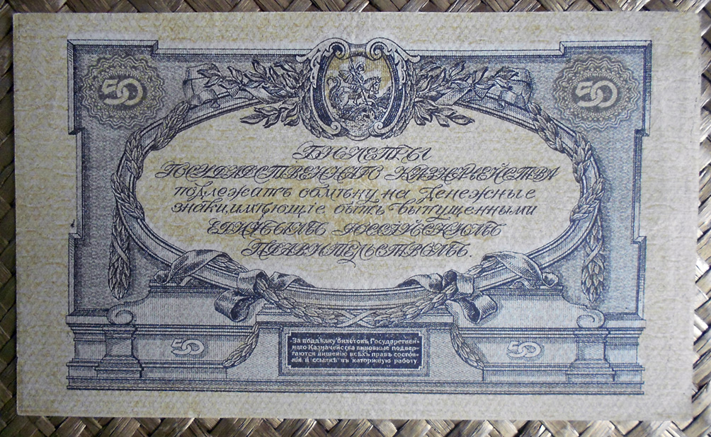 El billete de 50 rublos de Rusia del Sur de 1919 – Gral. Wrangel nos muestra un pórtico clásico bajo el que se sienta una Madre Rusia protectora junto a dos adolescentes que sujetan un martillo y un ancla; la alegoría ocupa la parte izquierda de la composición, que se completa con dos columnas sujetando un dintel cornisa en cuyo centro se extiende el águila bicéfala entre ramas de laurel y cintas. Bajo los capiteles de ambas columnas dos águilas mirando a izquierda y derecha del pórtico. Al pie de las columnas, entre ramas, un jarrón y una espada. Textos en ruso y series en negro.