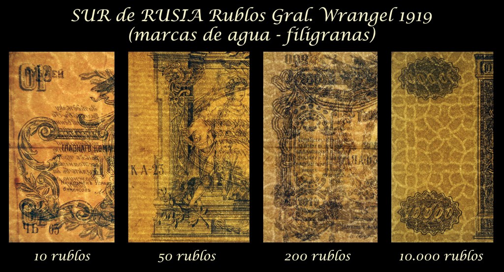 Contemplaremos las emisiones para el Alto Mando de las Fuerzas Militares del Sur de Rusia en 1919. Revisamos los 10 rublos, 50 rublos, 200 rublos, 1.000 rublos y 10.000 rublos de South Russia de 1919 o billetes del General Wrangel.