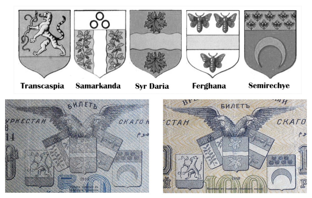El artístico grabado de estos dos valores mayores (50 y 100 rublos) recoge los emblemas o escudos de armas de los distintos Oblast que agrupa. Así el escudo de Transcaspia nos muestra en su blasón un tigre siberiano sujetando un arco con la cuerda rota, el de Samarcanda tres anillos y debajo dos ramas de morera, el de Syr Darja dos hojas de vid separadas por una cinta que simboliza el río Syr Darja, el de Ferghana nos muestra tres polillas de gusano de seda y el de Semirechye una trama doble de águilas bicéfalas y bajo ellas una media luna invertida.