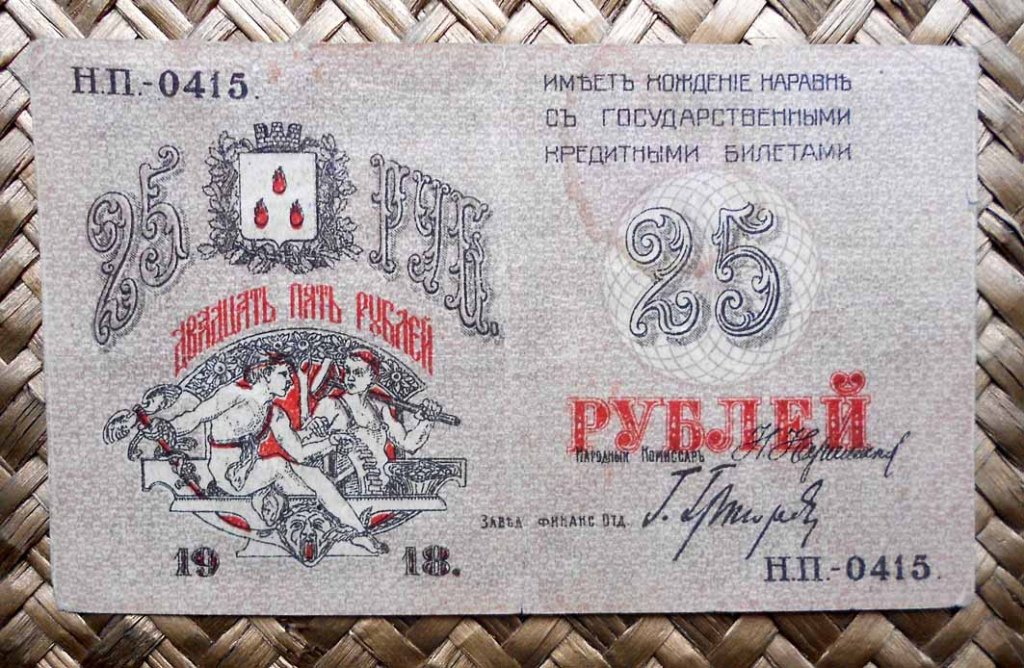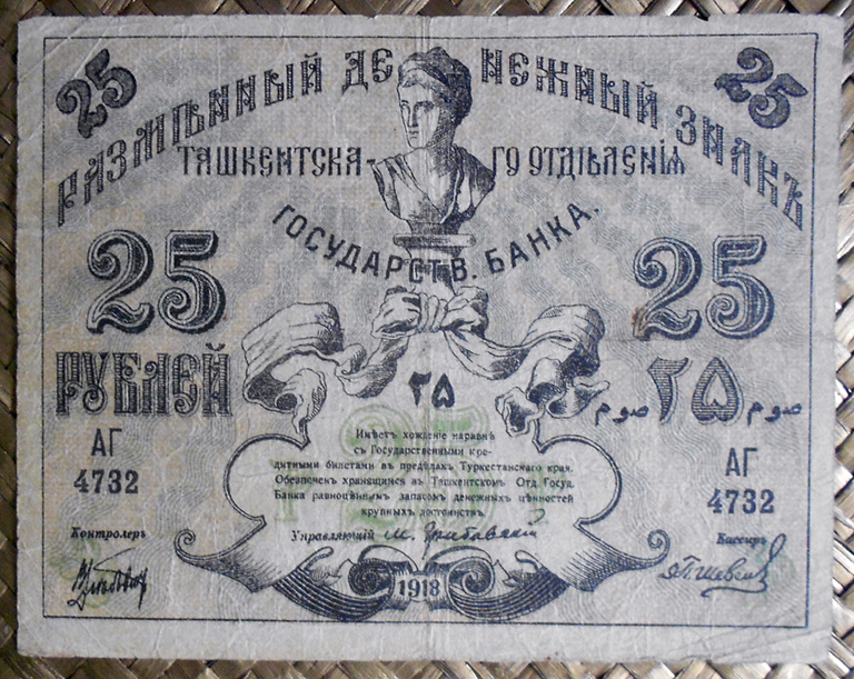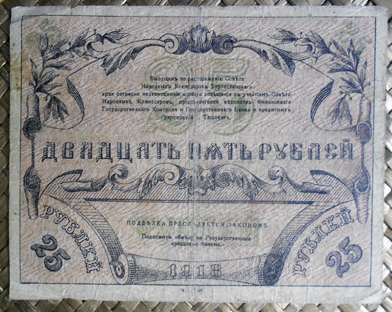 El billete de 25 rublos de Turkestán -Taskent de 1918 también comparte composición de grabados con los anteriores, siendo su cromaticidad principal en tonos grises con valores en verde y firmas en negro.
