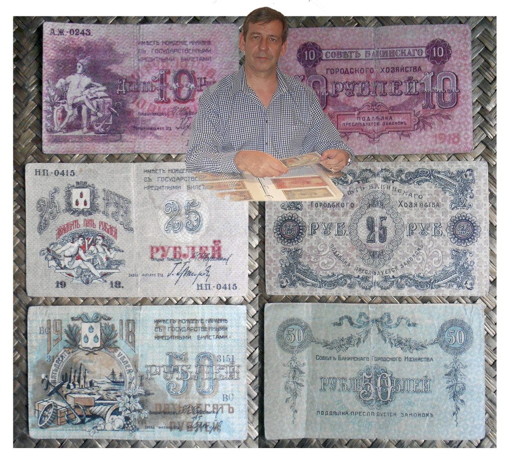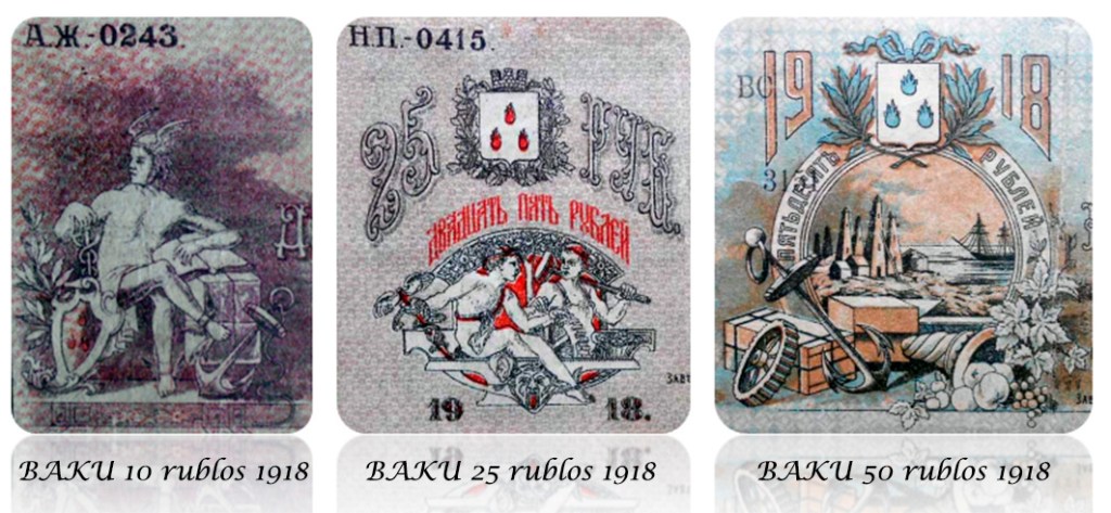 Durante ese corto periodo (1918-1919) la Administración municipal de la Comuna de Baku y su Comisariado económico decidieron emitir una pequeña serie de billetes para circulación por la provincia de Baku y el distrito de Daghestan. Se emitieron solamente tres valores (10, 25 y 50 rublos) de tamaño pequeño en comparación con el formato imperal de unos años atrás. Contemplaremos los billetes de 10, 25 y 50 rublos de Baku de 1918.