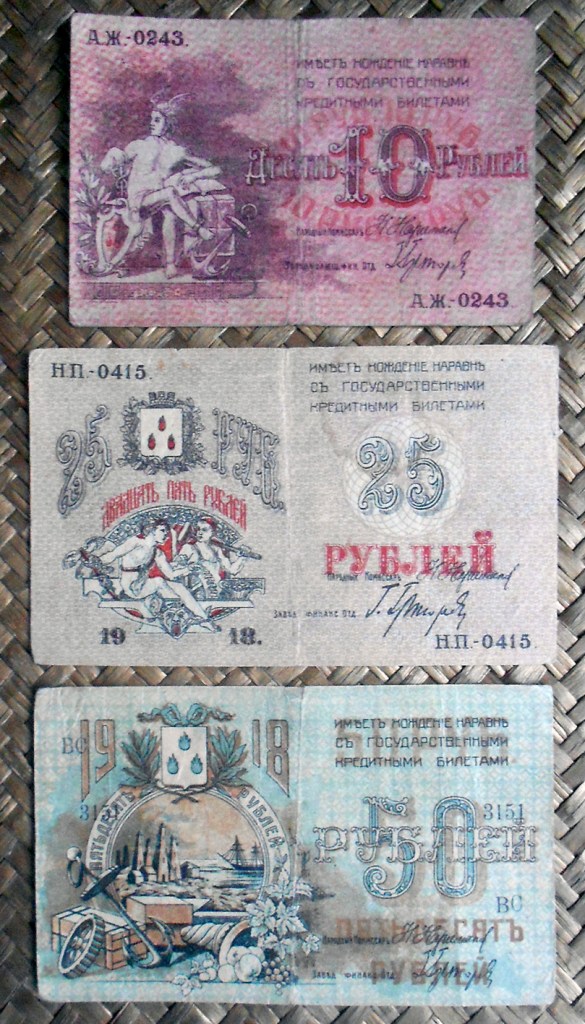 Eran tiempos difíciles, de Guerra Mundial y Revolución Civil, y la depresión de la economía rusa rompía lazos entre su centro administrativo y sus regiones. La escasez de liquidez y la dificultad de control y prevención de las autoridades centrales con estas emisiones locales, hizo de estos billetes la mejor opción para soportar los presupuestos y economías regionales.
