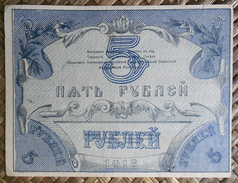 El billete de 5 rublos de Turkestán (Distrito) de 1918 nos ofrece en su anverso el busto clásico de una mujer sobre un pedestal, bajo el que se extiende una cinta anudada al centro y cubriendo a derecha e izquierda una cartela alabeada con texto en ruso. Textos en ruso y valores (texto y número) en ruso y persa. Firmas: dos impresas en azul y otra estampillada en negro. Los números de serie en tipografía negra. Cromaticidad predominante en tonos azules. Para el reverso una cartela apergaminada con motivos florales con textos y números ya solo en ruso.