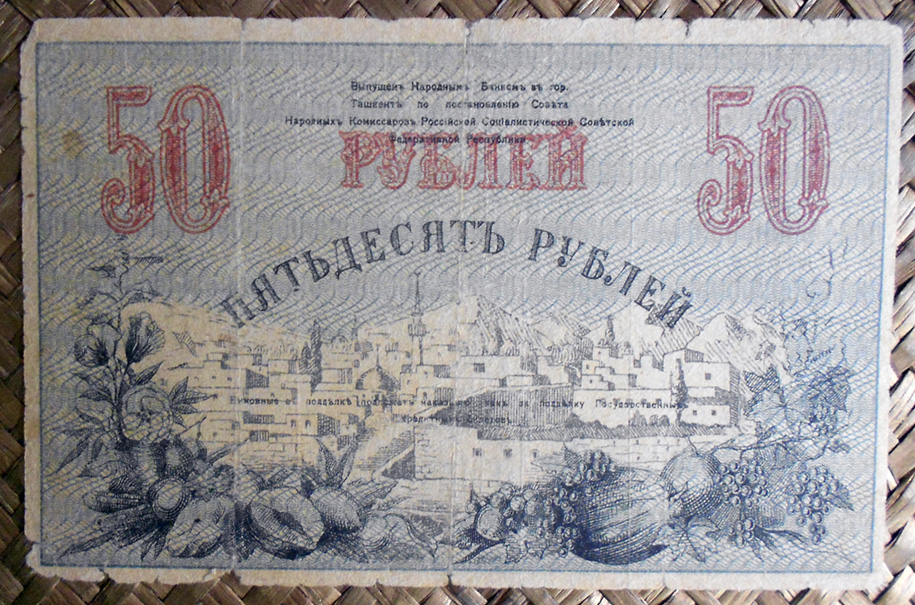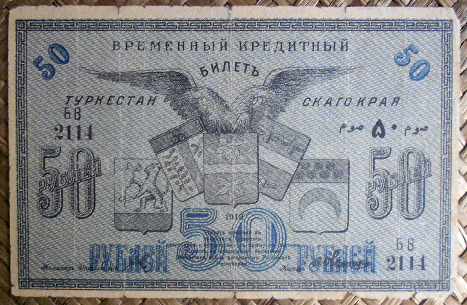 El billete de 50 rublos de Turkestán (Distrito) de 1919 nos ofrece al anverso un águila bicéfala sin corona con las alas extendidas, dando protección a los cinco escudos de los Oblast que forman el territorio. Textos en ruso y valores (texto y números) en ruso y persa. Cromaticidad azulada clara con valores en azul marino. Firmas y nºs de serie en negro.