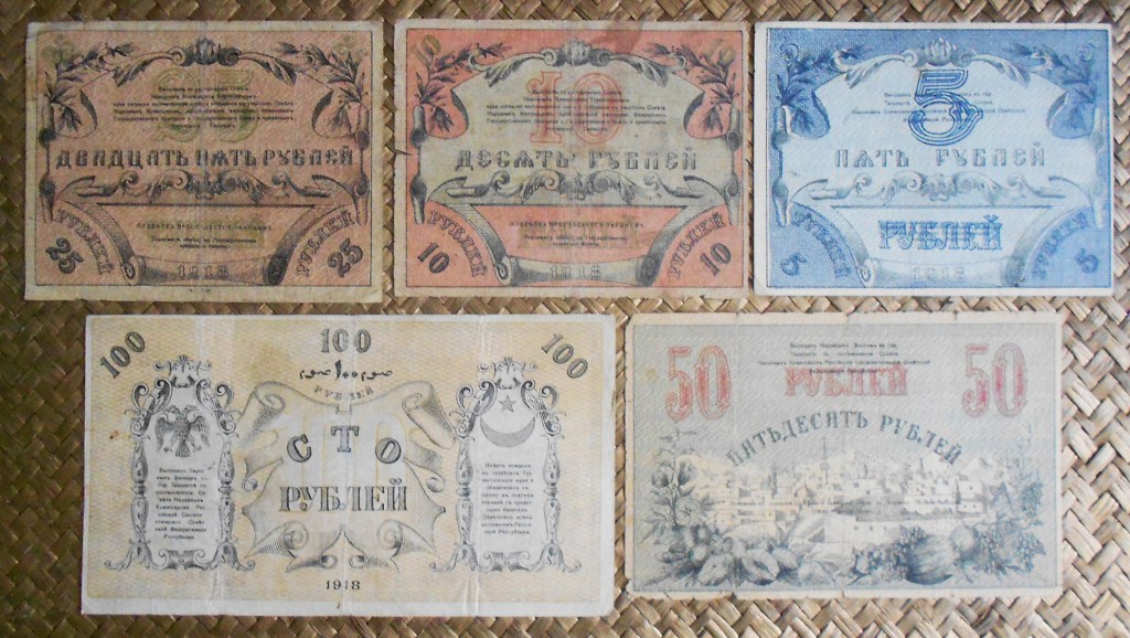Contemplaremos los billetes emitidos en 1918 para Taskent (capital del Turkestán Ruso) y en 1919 para el Distrito del Turkestán. Revisaremos los ejemplares de 10 y 25 rublos de Turkestán -Taskent de 1918, el ejemplar de 5 y de 100 rublos de 1918 y el de 50 rublos de 1919 de Turkestán District.