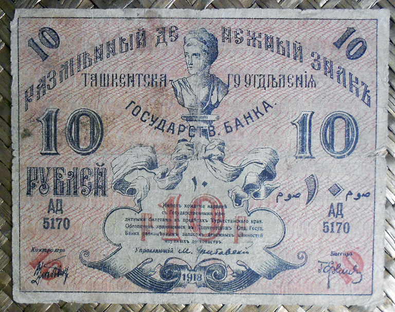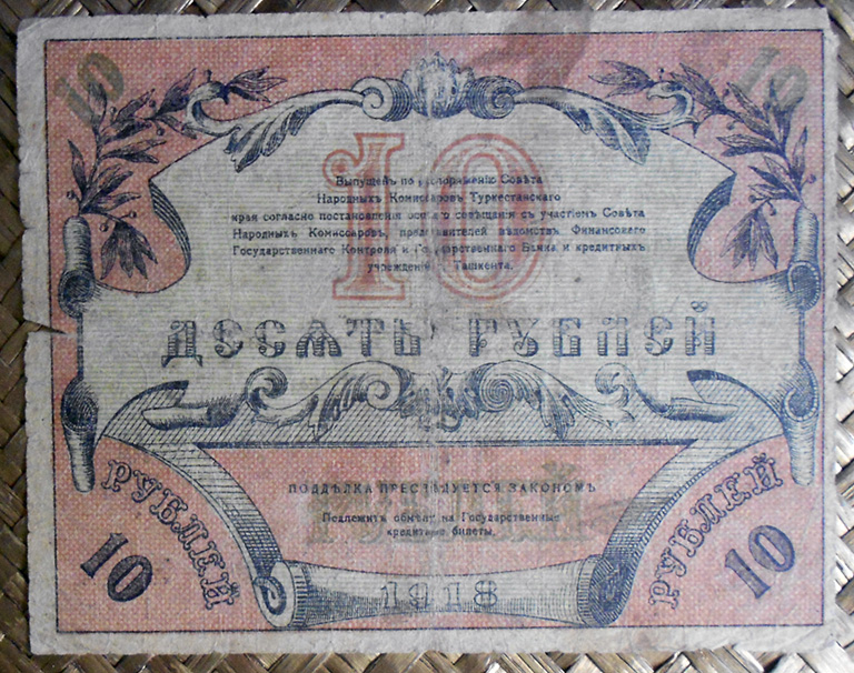 El billete de 10 rublos de Turkestán –Taskent de 1918 repite la misma composición de grabados anterior, tanto para anverso como reverso, cambiando a cromaticidad predominante naranja salmón con valores en rojo. Las tres firmas impresas en negro, así como los números de serie.