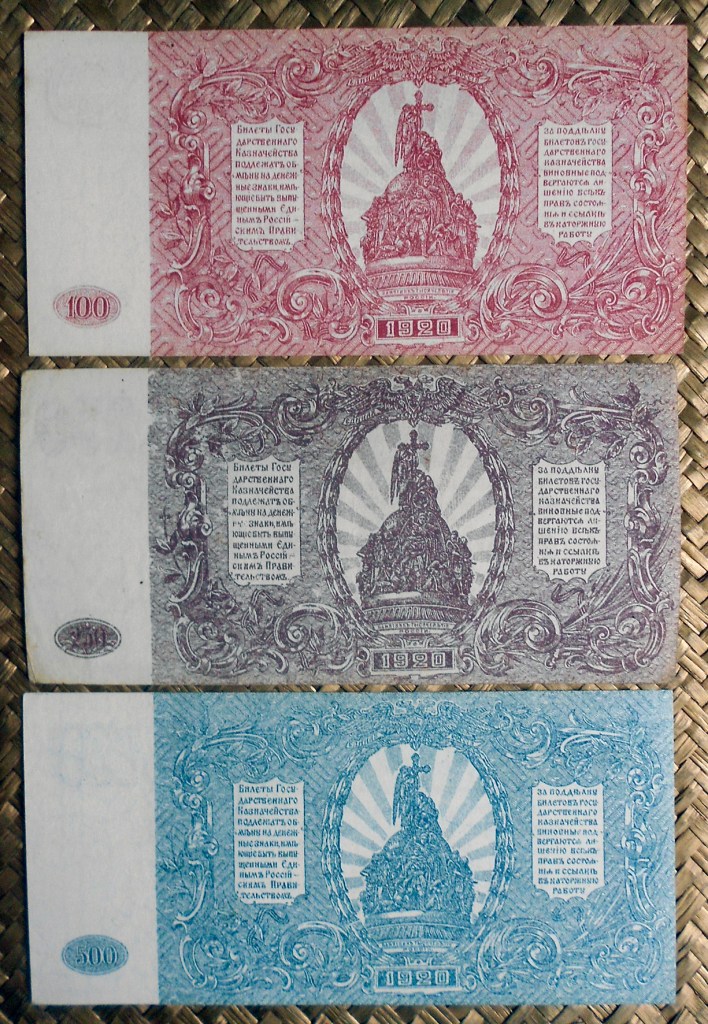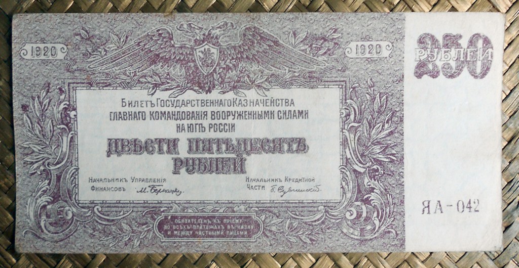 Contemplaremos las emisiones para el Alto Mando de las Fuerzas Militares del Sur de Rusia. Revisamos los 100 rublos, 250 rublos y 500 rublos de South Russia de 1920 o billetes del General Wrangel.