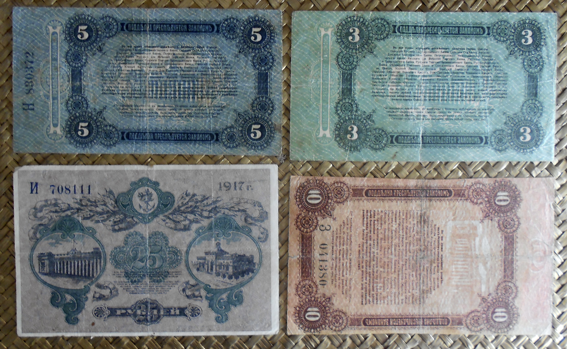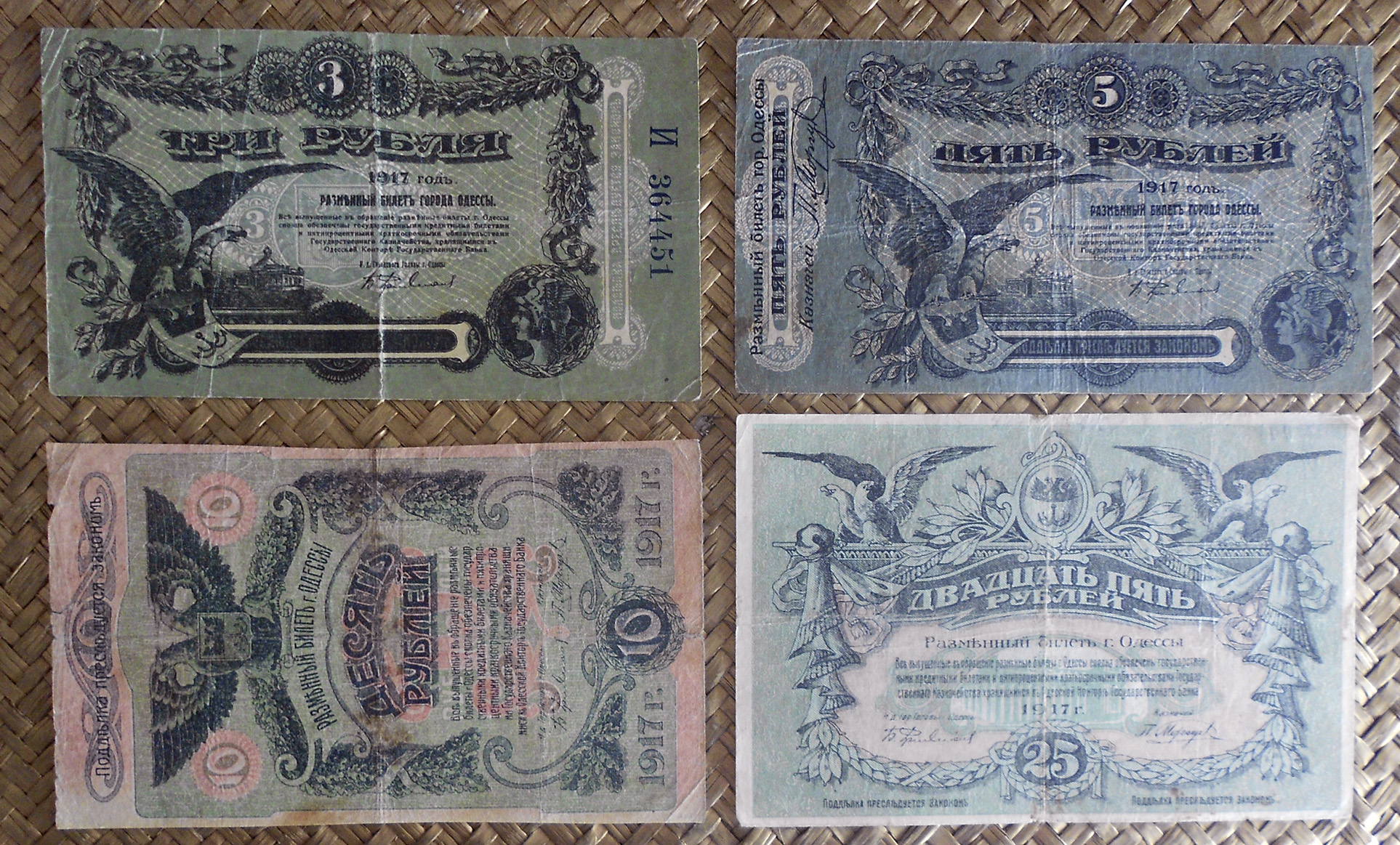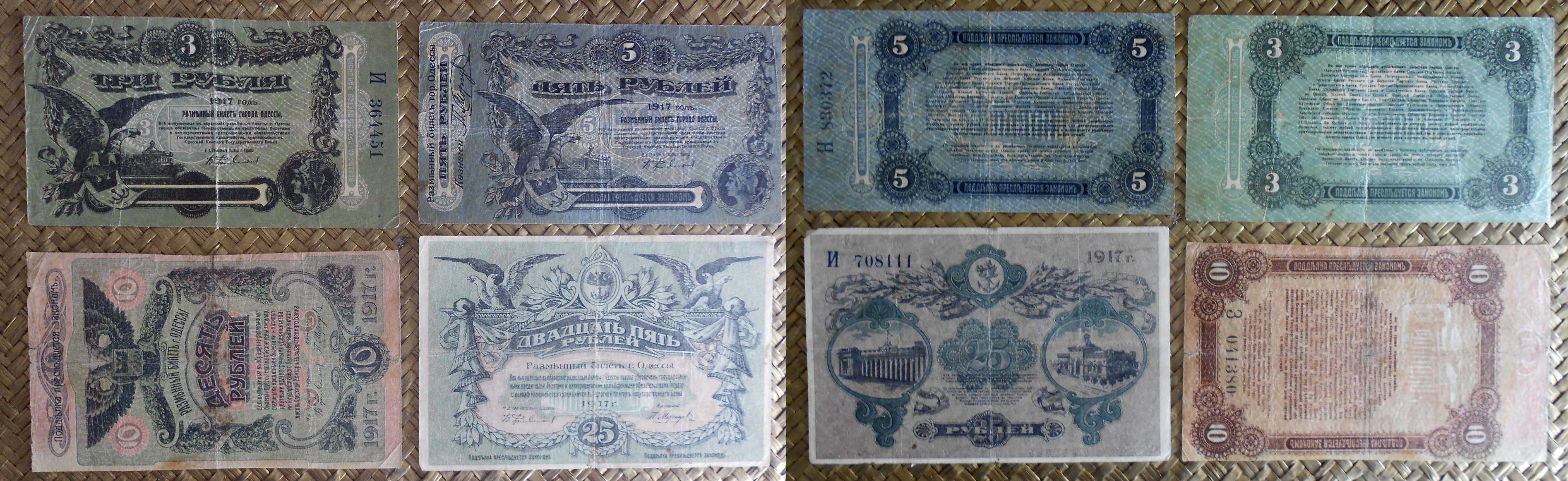 Entre 1917 y 1922 estos billetes de Odessa vieron pasar a tropas austro-alemanas de la WWI, después vendría el General Pavlo Skoropadsky (antes General del Imperio Ruso) para el Estado de Ucrania (Hetmanato de Skoropadsky, contrario a la República Popular de Ucrania), luego Simon Petliura (nuevamente como República Popular Ucraniana). En 1920 la ciudad ya estaba en manos de los bolcheviques y sus billetes y la hiperinflación acabarían con los rublos tanto imperiales como locales. Contemplemos estos billetes municipales de 3, 5, 10 y 25 rublos de Odessa de 1917, de antes de que esto pasase.