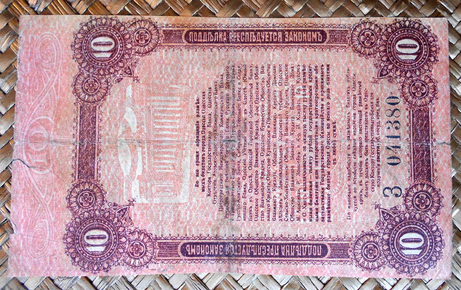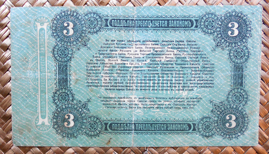 El billete de 3 rublos de Odessa de 1917 nos deleita con un águila bicéfala sujetando con sus garras el escudo de armas de la Odessa imperial (aunque más bien pareciese dos águilas siamesas con un único par de alas en intención de levantar el vuelo). A su lado la antigua Bolsa de la ciudad (ahora sede del Teatro Filarmónico de Odessa). Todo ello en el interior de un marco de lazos y ramas de laurel y frutos que cierran el anverso con un medallón con la cabeza de un Mercurio con casco alado en la esquina inferior derecha. Cromaticidad verdosa y negra con número de serie en azul en el lateral derecho.