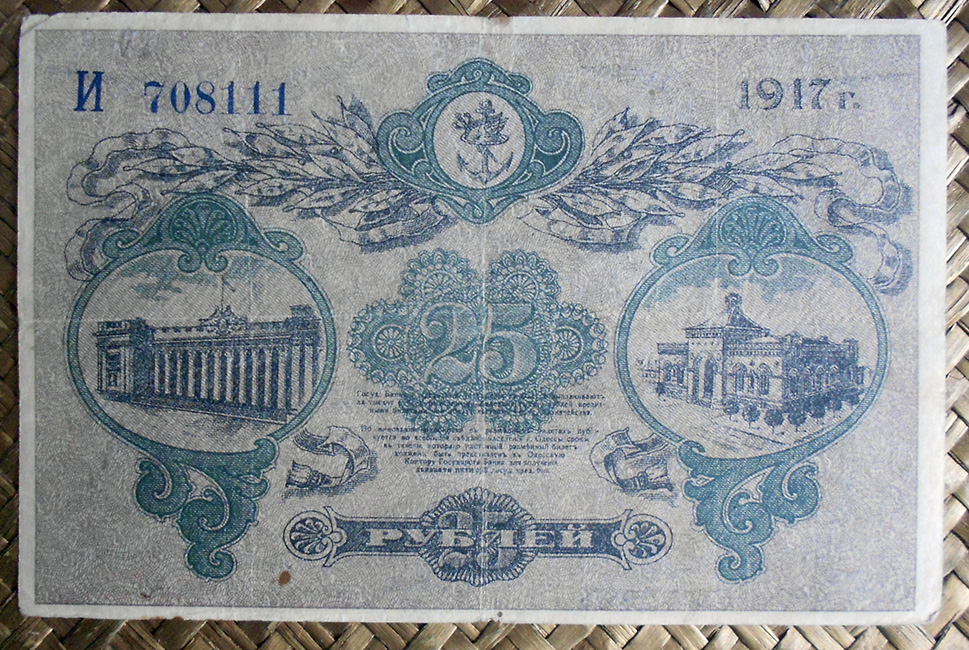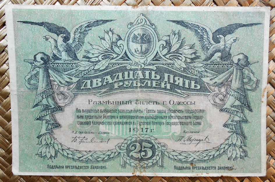 El billete de 25 rublos de Odessa de 1917 nos ofrece en su anverso un capitel en cuyo centro reposa un óvalo con el escudo imperial de Odessa (águila bicéfala sin corona sobre ancla de cuatro ganchos). A ambos lados dos águilas siamesas (con dos cuerpos, dos cabezas y sus alas abiertas, aunque más bien pareciesen gaviotas, eso sí muy vitales). El capitel queda sujeto verticalmente hacia abajo por sendas cortinas de tela en forma de cono rizado del que salen cordones de hojas entrelazadas, confluyendo en el centro inferior en una corona con el valor del billete “25” y la fecha “1917r”. Cromaticidad verde clara con grabados en negro.