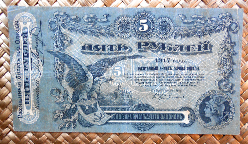 El billete de 5 rublos de Odessa de 1917 es muy semejante al anterior. Solo cambia la impresión en el lateral izquierdo, y en vertical, del valor y un nuevo valedor del billete con su firma, pasando la numeración de serie, también en azul, al reverso. Cromaticidad azulada y reverso con la misma composición anterior, salvo el valor, que cambia.