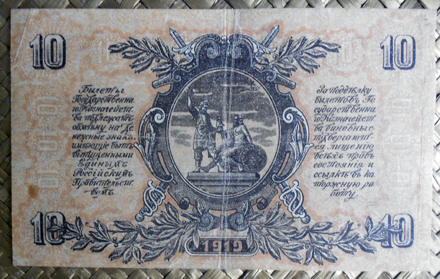 El billete de 10 rublos de Rusia del Sur de 1919 – Gral. Wrangel nos ofrece en su anverso una composición de grecas florales formando un marco sobre el que se posa el águila bicéfala que sujeta una cinta con sus garras y lleva en su pecho un blasón con San Jorge y el dragón. Textos en ruso y nºs de serie en tipografía negra. Cromaticidad anaranjada con grabados en negro.