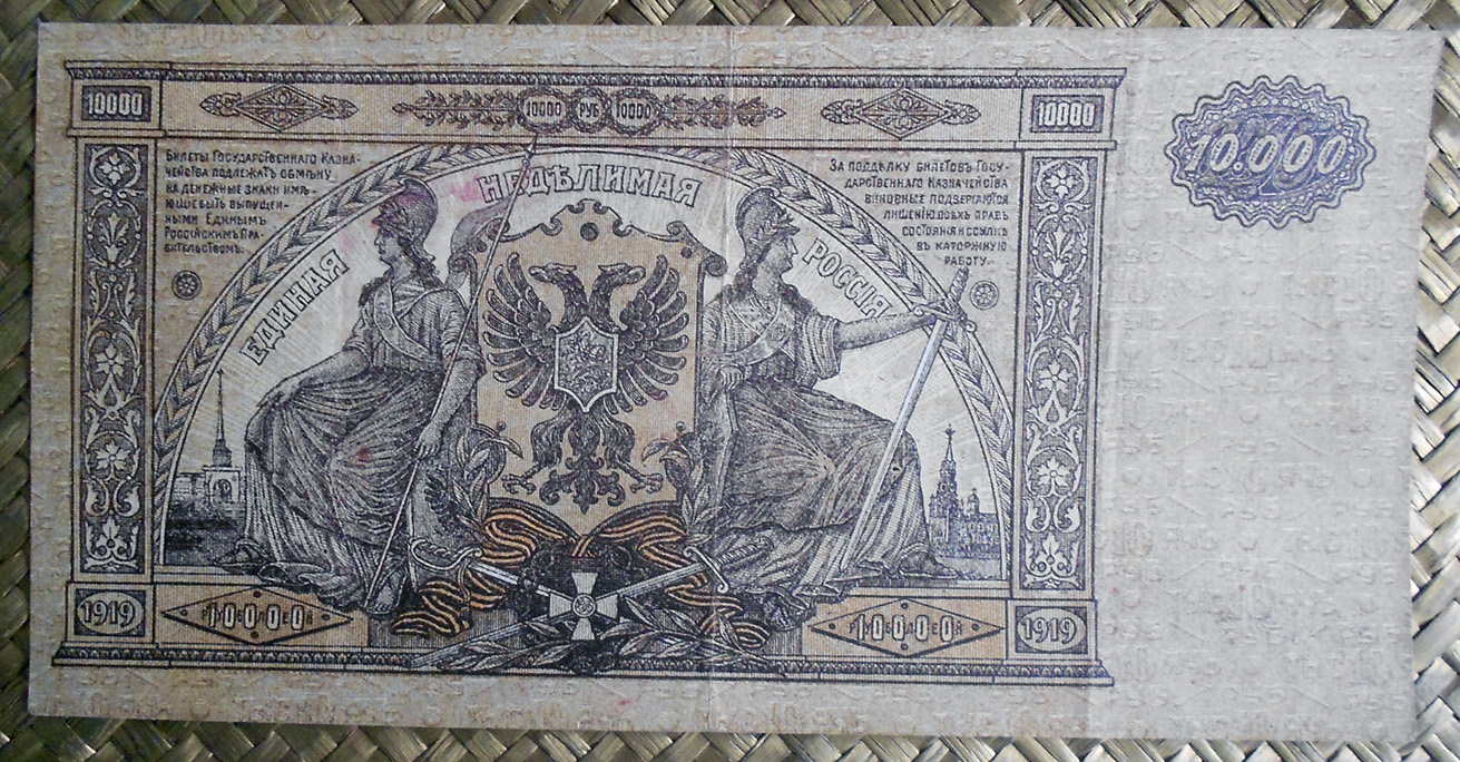 El billete de 10.000 rublos de Rusia del Sur de 1919 – Gral. Wrangel nos ofrece un anverso netamente imperial, no solo por su tamaño, sino por el barroquismo de su diseño. Se compone de un marco floral y una zona a la izquierda sin enmarcar con el dibujo de San Jorge y el dragón en el interior de un rombo; bajo él una roseta con el valor en nº. El marco floral muestra a los laterales sendas espadas encintadas con ramas de laurel y la banda de la insignia imperial de S. Jorge; en la parte superior el águila bicéfala con una cinta en sus garras. Se rodea el texto interior del marco con coronas y ramas encintadas en las cuatro esquinas y un cordón de hojas al centro del pie. Cromaticidad verde amarronada con nºs de serie en negro.
