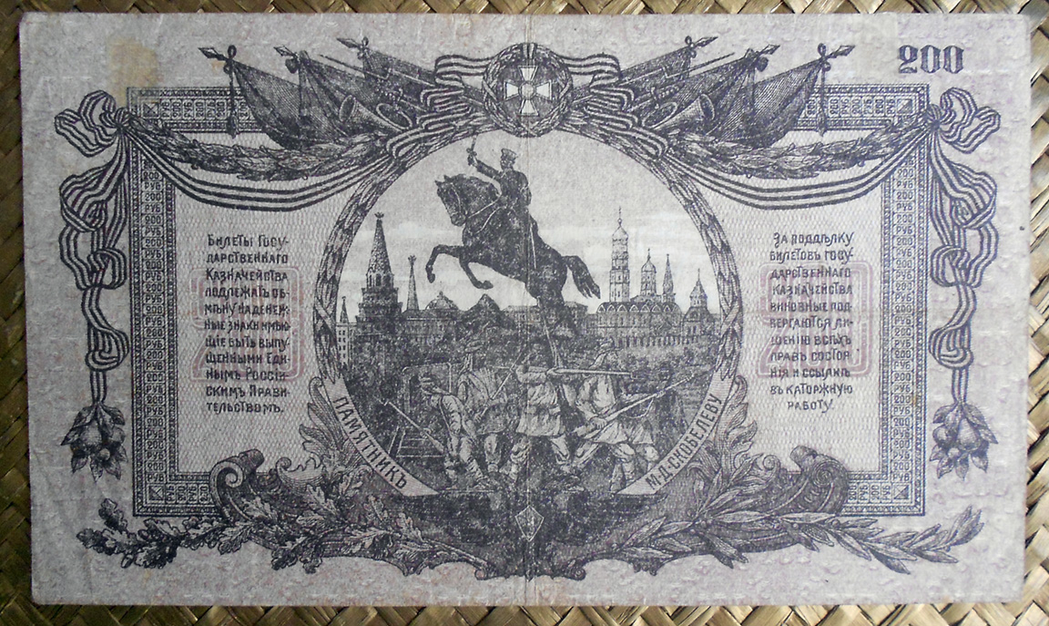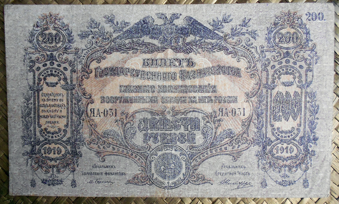 El billete de 200 rublos de Rusia del Sur de 1919 – Gral. Wrangel nos muestra al anverso una barroca composición al puro estilo imperial, presidida por el águla bicéfala (sin corona) con San Jorge en su pecho. Al pie vuelve a representarse a S.  Jorge y el dragón en un círculo central. Textos en ruso y nºs de serie en tipografía negra. Cromaticidad grisácea amarronada con grabados en negro.