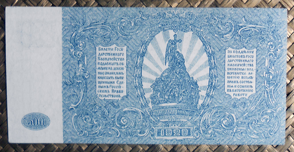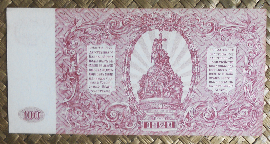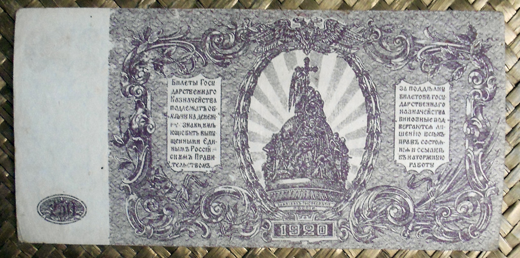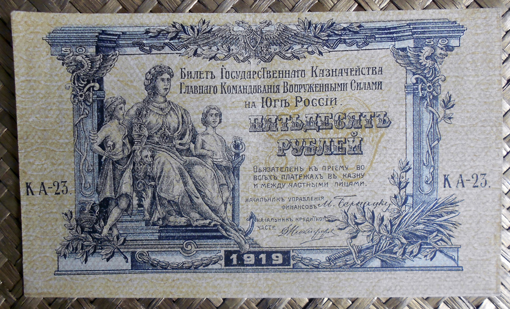 El billete de 50 rublos de Rusia del Sur de 1919 – Gral. Wrangel nos muestra un pórtico clásico bajo el que se sienta una Madre Rusia protectora junto a dos adolescentes que sujetan un martillo y un ancla; la alegoría ocupa la parte izquierda de la composición, que se completa con dos columnas sujetando un dintel cornisa en cuyo centro se extiende el águila bicéfala entre ramas de laurel y cintas. Bajo los capiteles de ambas columnas dos águilas mirando a izquierda y derecha del pórtico. Al pie de las columnas, entre ramas, un jarrón y una espada. Textos en ruso y series en negro.