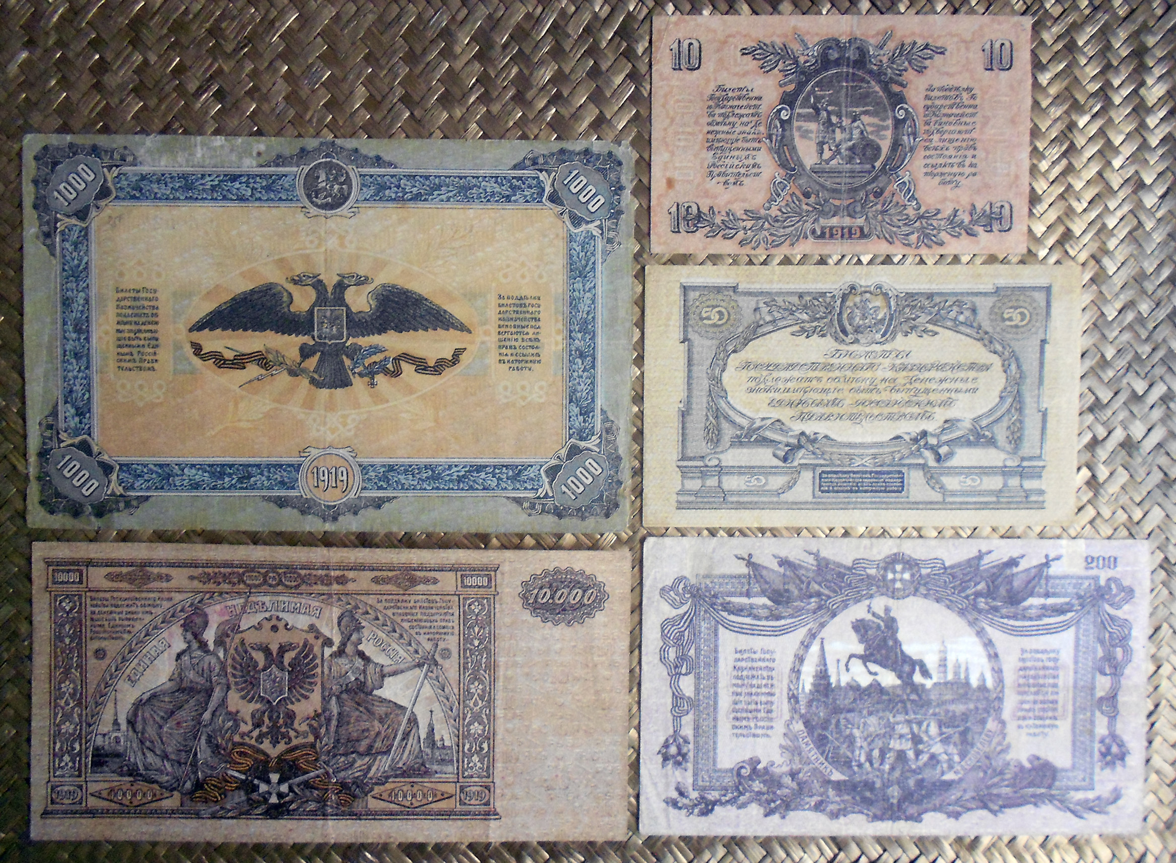 Contemplaremos las emisiones para el Alto Mando de las Fuerzas Militares del Sur de Rusia en 1919. Revisamos los 10 rublos, 50 rublos, 200 rublos, 1.000 rublos y 10.000 rublos de South Russia de 1919 o billetes del General Wrangel.