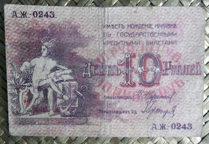 El billete de 10 rublos de Baku de 1918 nos ofrece la alegoría del dios Mercurio sentado al lado del escudo de armas local y apoyado sobre un libro que descansa en una bala o fardo de mercancía. Con su brazo derecho sujeta un caduceo y a sus pies reposa un ancla. Acertado guiño para un área de gran importancia tanto comercial como marítima. Cromaticidad predominante rosada con textos y números en negro y rojo.