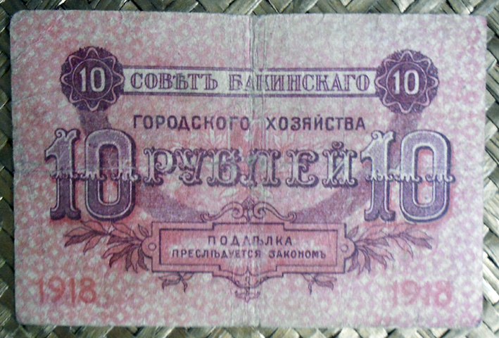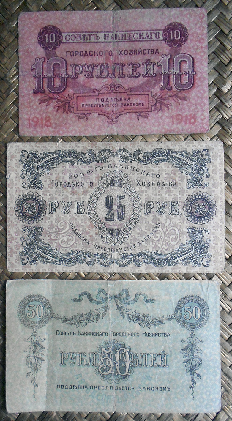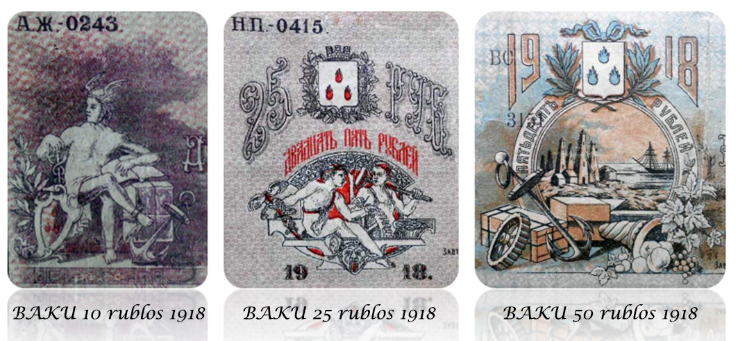 Durante ese corto periodo (1918-1919) la Administración municipal de la Comuna de Baku y su Comisariado económico decidieron emitir una pequeña serie de billetes para circulación por la provincia de Baku y el distrito de Daghestan. Se emitieron solamente tres valores (10, 25 y 50 rublos) de tamaño pequeño en comparación con el formato imperal de unos años atrás. Contemplaremos los billetes de 10, 25 y 50 rublos de Baku de 1918.