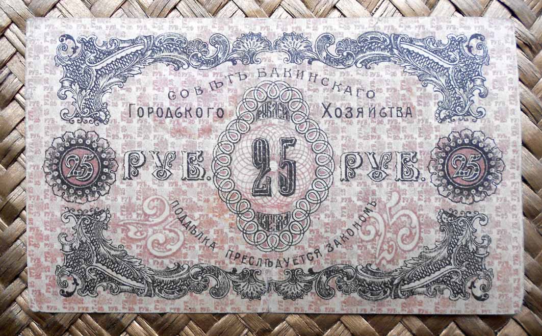 El billete de 25 rublos de Baku de 1918 nos muestra al dios Mercurio apoyado en un yunque y sosteniendo el caduceo. A su lado un obrero que se apoya en una gran rueda de engranaje y con un martillo minero al hombro. A los pies del minero una cornucopia llena de monedas y a los pies de Mercurio una máscara clásica. Sobre ambos el escudo de Baku (blasón con las tres llamas entre hojas de roble y coronado por una torre almenada). Cromaticidad predominante gris amarronada con inserciones en rojo.