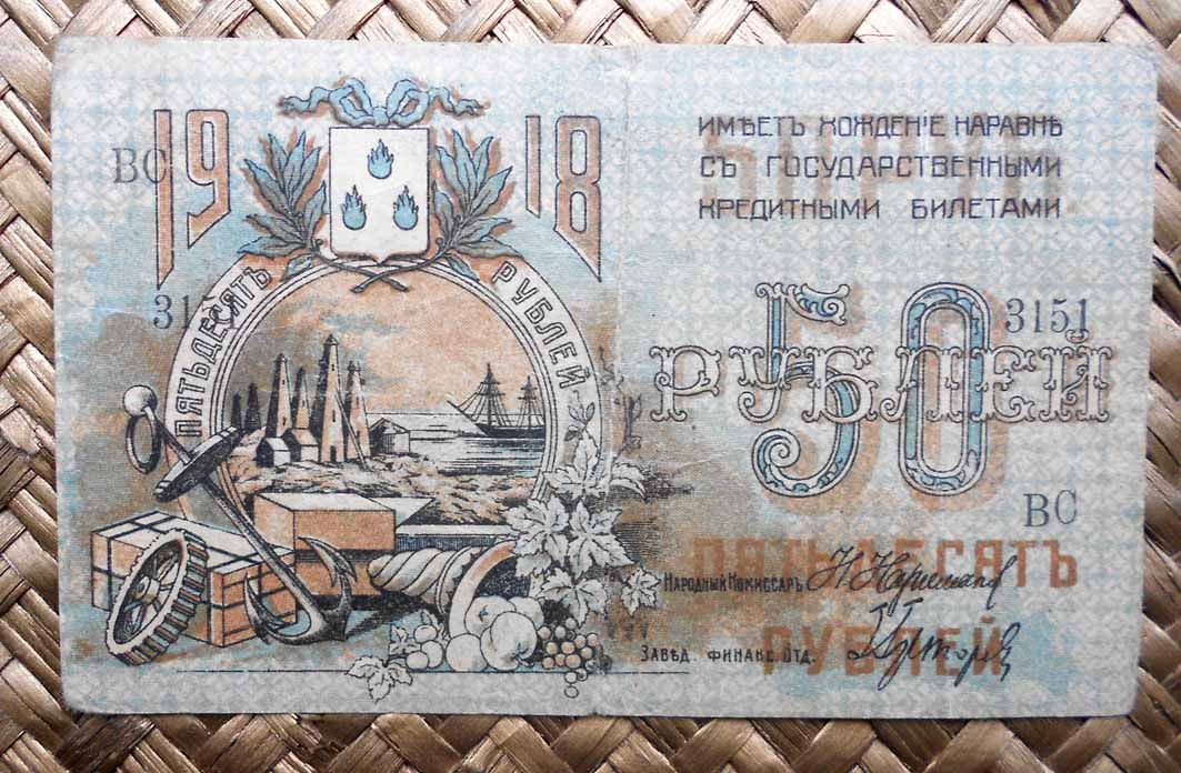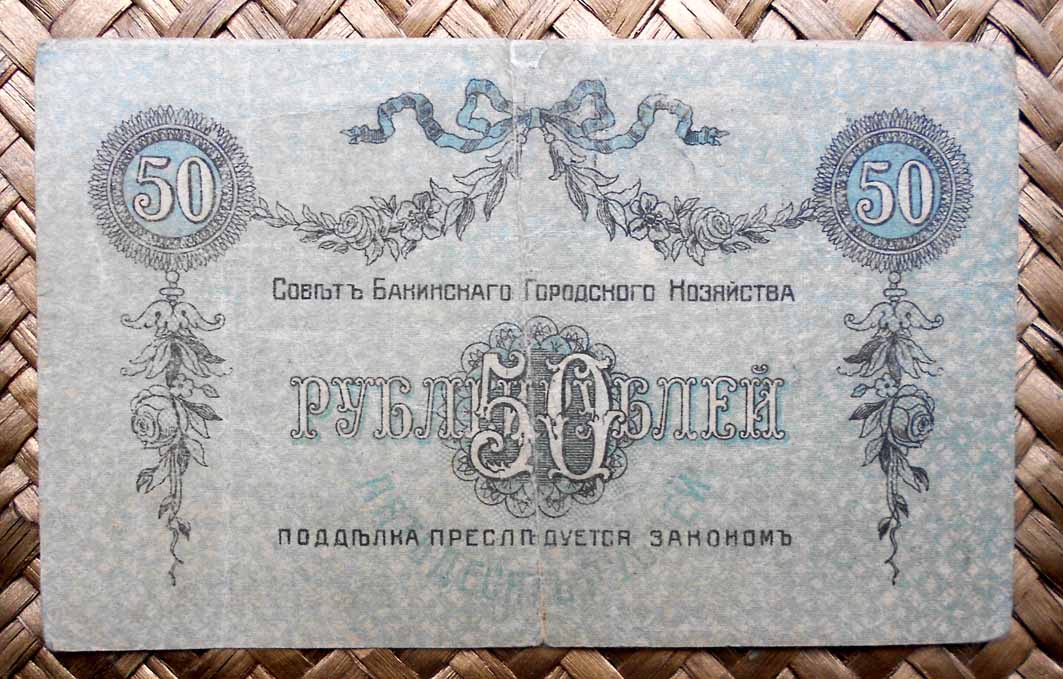El billete de 50 rublos de Baku de 1918 nos ofrece un disco en cuyo interior se dibujan torres petrolíferas a la orilla y barcos anclados en el mar. Un anillo externo ofrece el valor del billete en texto ruso. Sobre el disco el escudo de armas entre ramas de laurel y bajo un lazo de cintas. Al pie del círculo una cornucopia con hojas y frutos, cajas de mercancías, un ancla y una rueda dentada; simbología nuevamente del poder industrial, marítimo y comercial del enclave. Cromaticidad predominante en azules y cremas con trazos marrones.