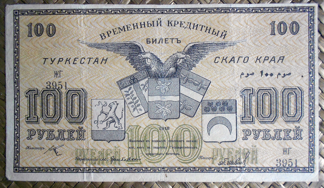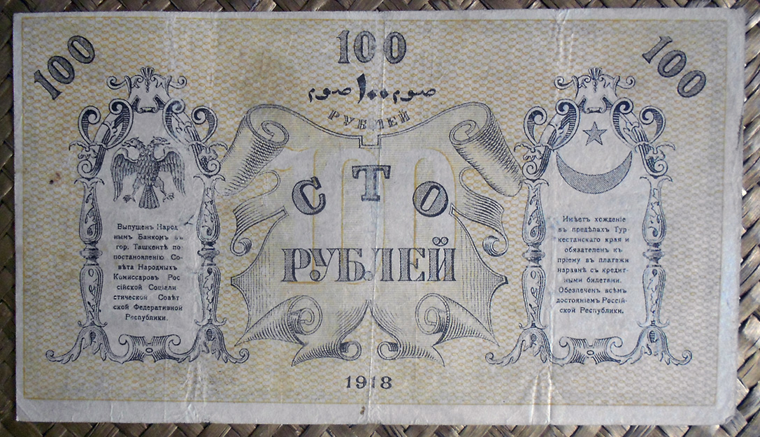 El billete de 100 rublos de Turkestán (Distrito) de 1918 nos ofrece al anverso la misma composición que el anterior, con el águila bicéfala cubriendo bajo sus alas los cinco escudos de los territorios que conforman el Turkestán soviético. Cambia la cromaticidad a amarilla amarronada con el valor en verde.