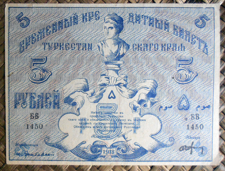 El billete de 5 rublos de Turkestán (Distrito) de 1918 nos ofrece en su anverso el busto clásico de una mujer sobre un pedestal, bajo el que se extiende una cinta anudada al centro y cubriendo a derecha e izquierda una cartela alabeada con texto en ruso. Textos en ruso y valores (texto y número) en ruso y persa. Firmas: dos impresas en azul y otra estampillada en negro. Los números de serie en tipografía negra. Cromaticidad predominante en tonos azules. Para el reverso una cartela apergaminada con motivos florales con textos y números ya solo en ruso.
