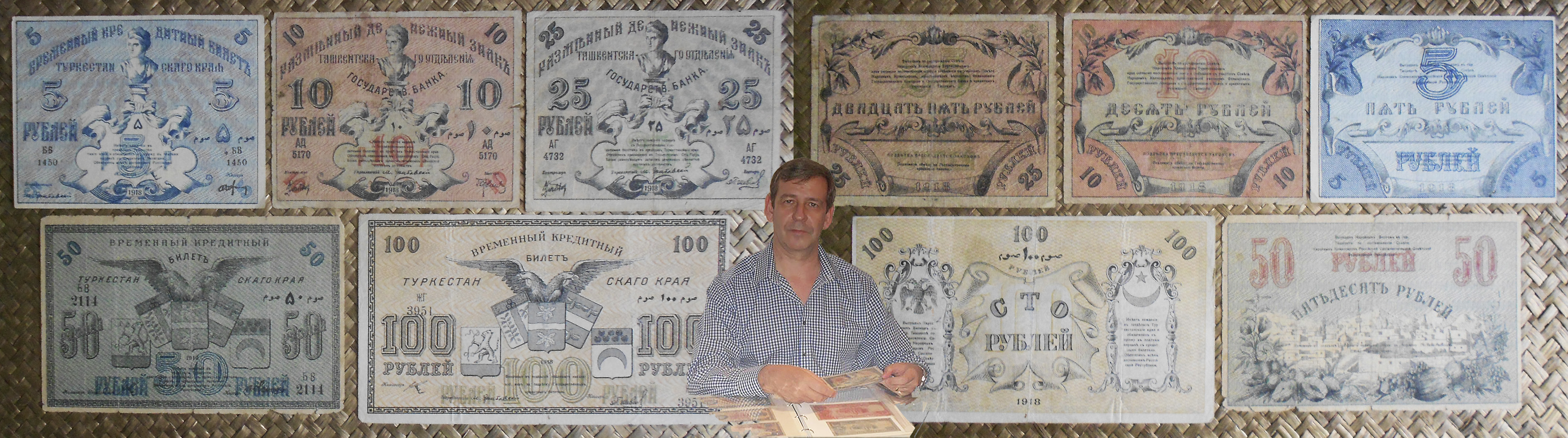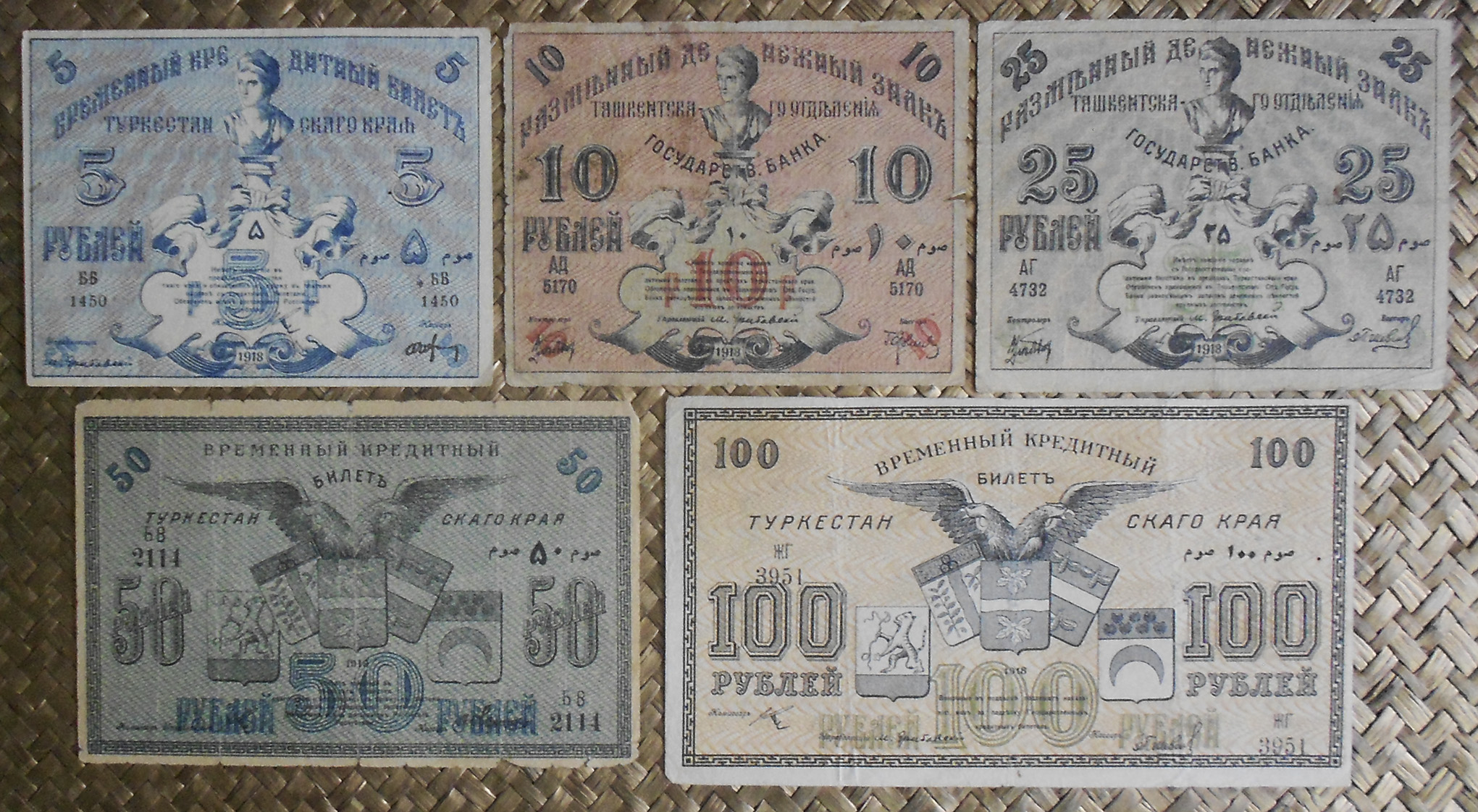 Contemplaremos los billetes emitidos en 1918 para Taskent (capital del Turkestán Ruso) y en 1919 para el Distrito del Turkestán. Revisaremos los ejemplares de 10 y 25 rublos de Turkestán -Taskent de 1918, el ejemplar de 5 y de 100 rublos de 1918 y el de 50 rublos de 1919 de Turkestán District.