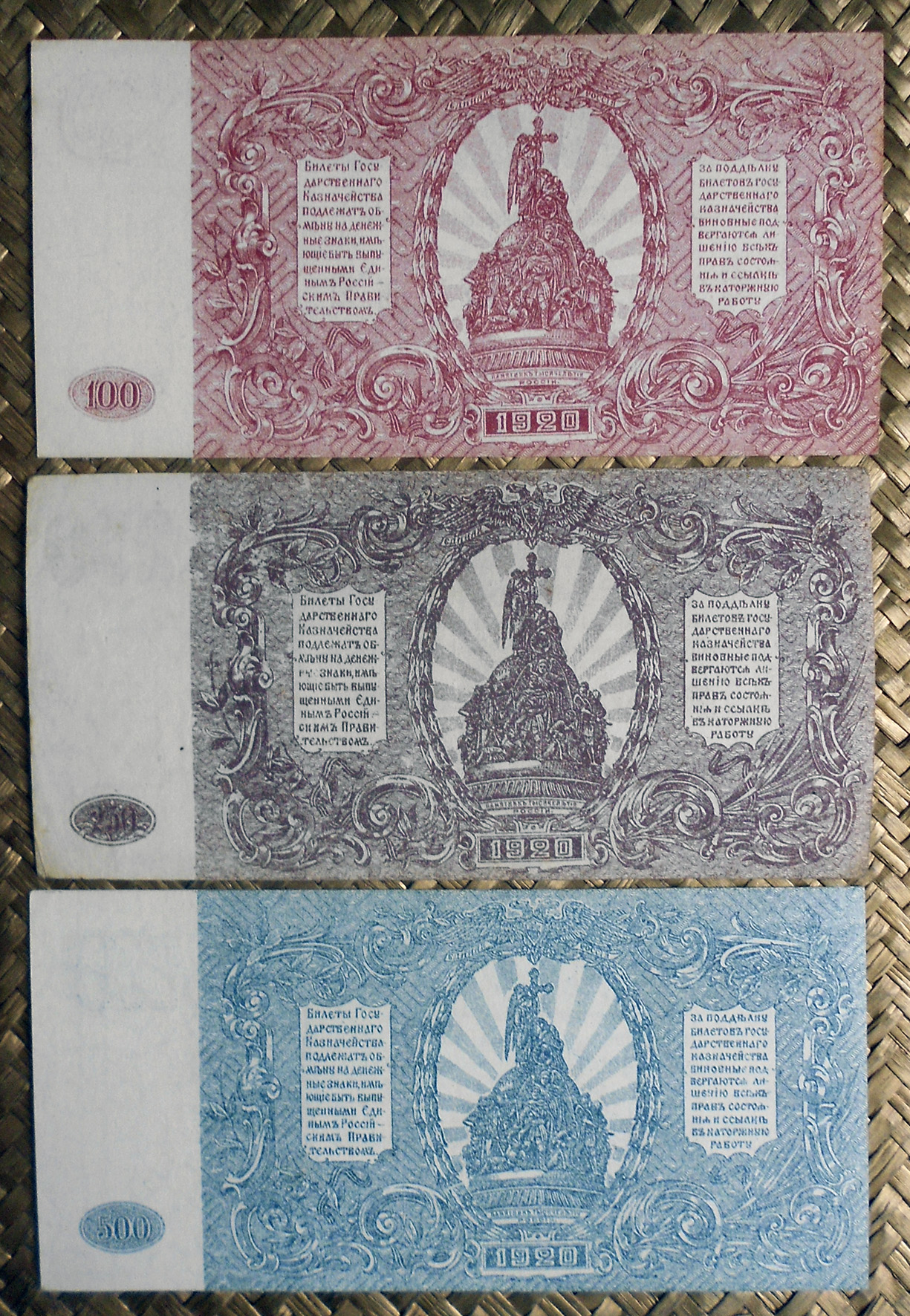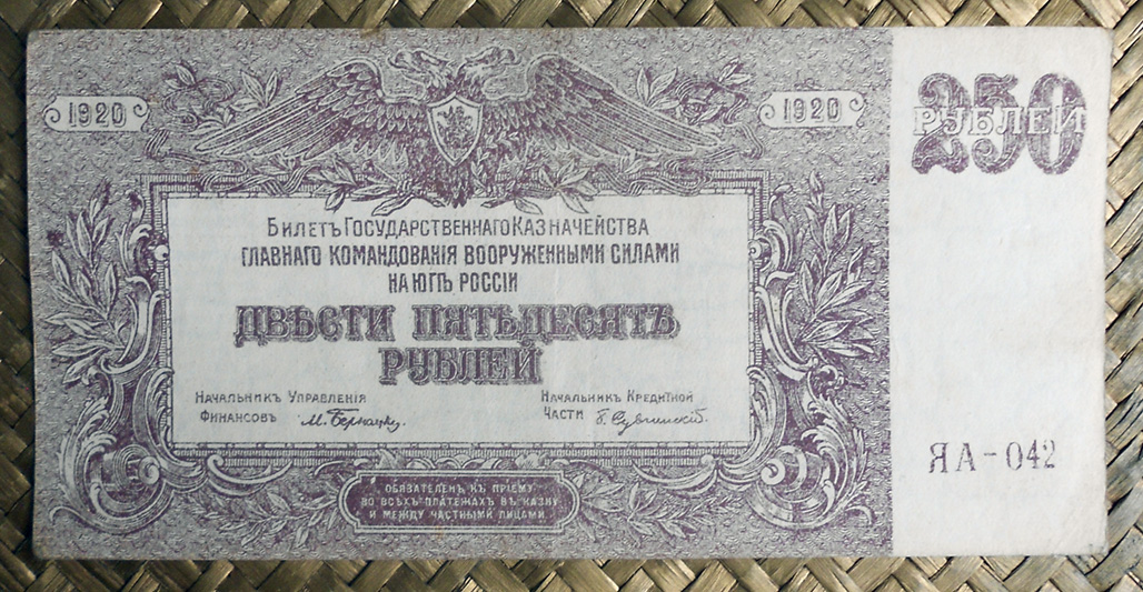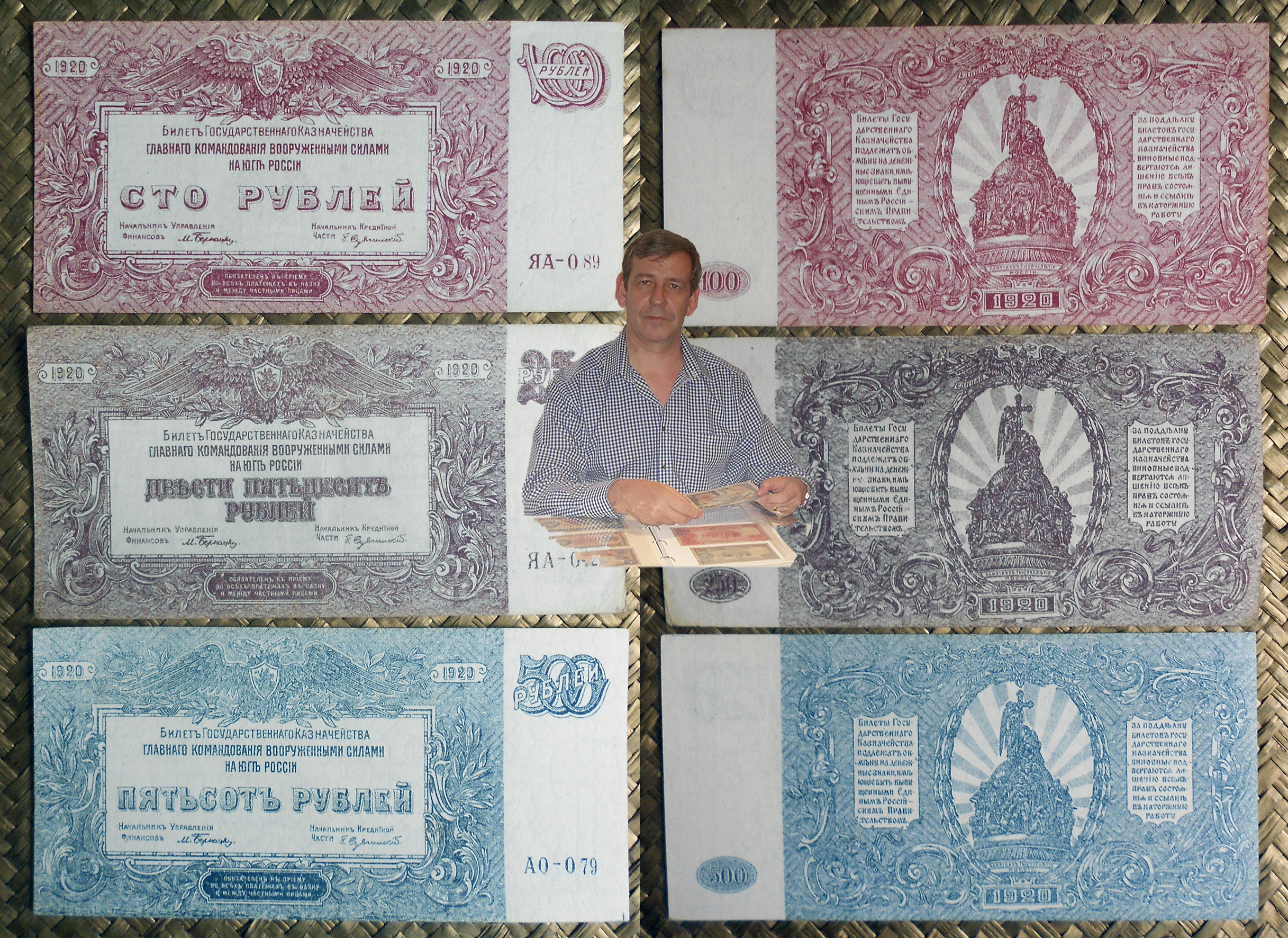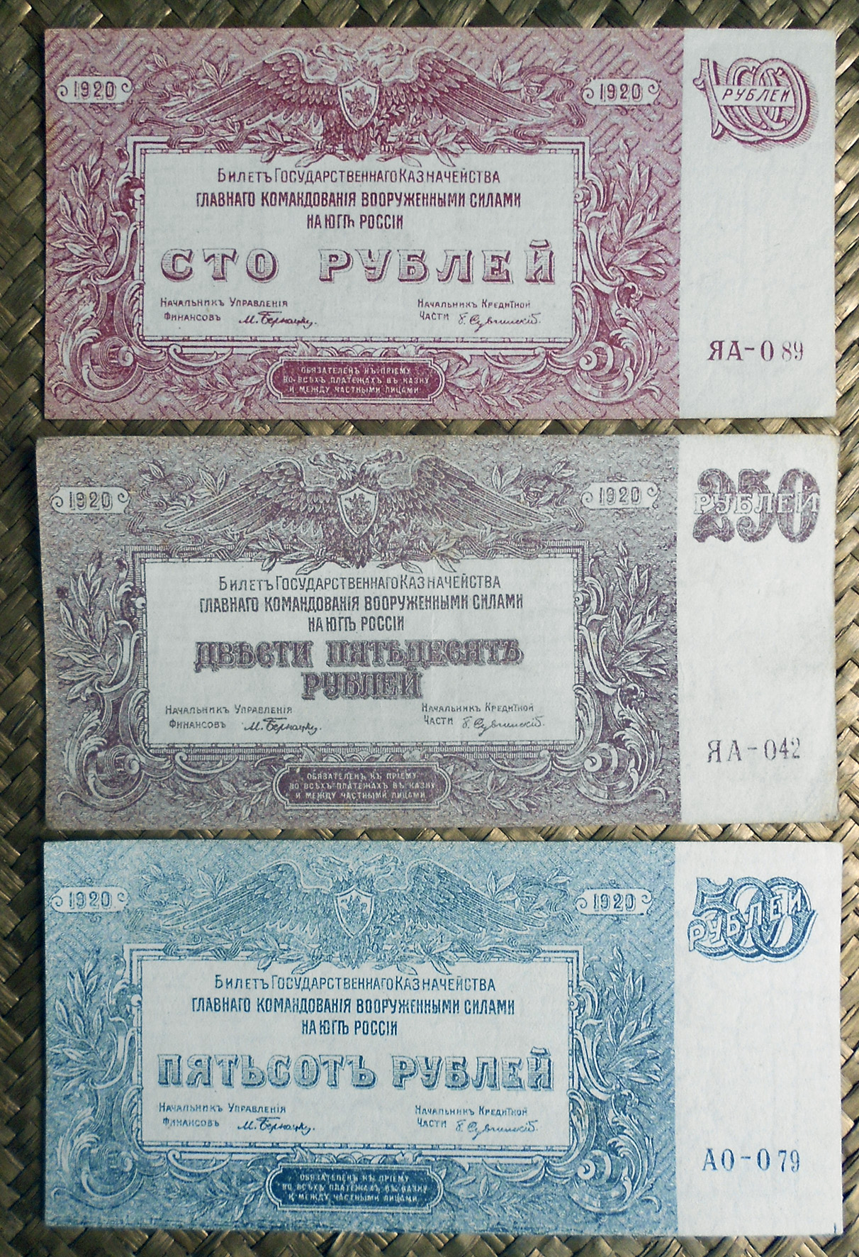 Contemplaremos las emisiones para el Alto Mando de las Fuerzas Militares del Sur de Rusia. Revisamos los 100 rublos, 250 rublos y 500 rublos de South Russia de 1920 o billetes del General Wrangel.