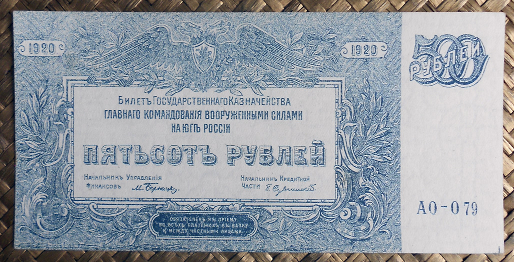 Desde “Miscelánea” volvemos a los tiempos de la Revolución Rusa para repasar un nuevo billetario emitido para uno de esos generales del bando contrarrevolucionario o de las tropas del “ejército blanco”. Militares que pertenecieron mayoritariamente a los ejércitos zaristas en la época del Imperio (Kolchak, Yudenich, Miller, Denikin, Wrangel, Kornilov, Krasnov, …). Esta vez revisaremos la segunda serie de rublos para los territorios de Rusia del Sur bajo el mando del General Wrangel, ya en 1920.