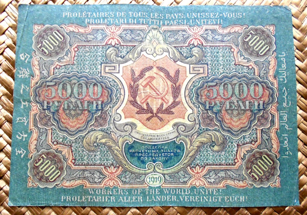 Esta vez le toca al billetario de uno de esos Generales combatientes. Los ejemplares que vamos a contemplar son parte de la serie de billetes/obligaciones que circularon en la Siberia del Almirante Kolchak, uno de los líderes del “Ejército blanco” (las tropas contrarrevolucionarias que combatirían a los bolcheviques en plena revolución). Veremos los ejemplares de 25, 50, 100, 250, 500, 1000 y 5000 rublos de la Rusia oriental siberiana (Siberia & Urales), emitidos por el “State Treasury of the Russian Provisional Government” en 1919.