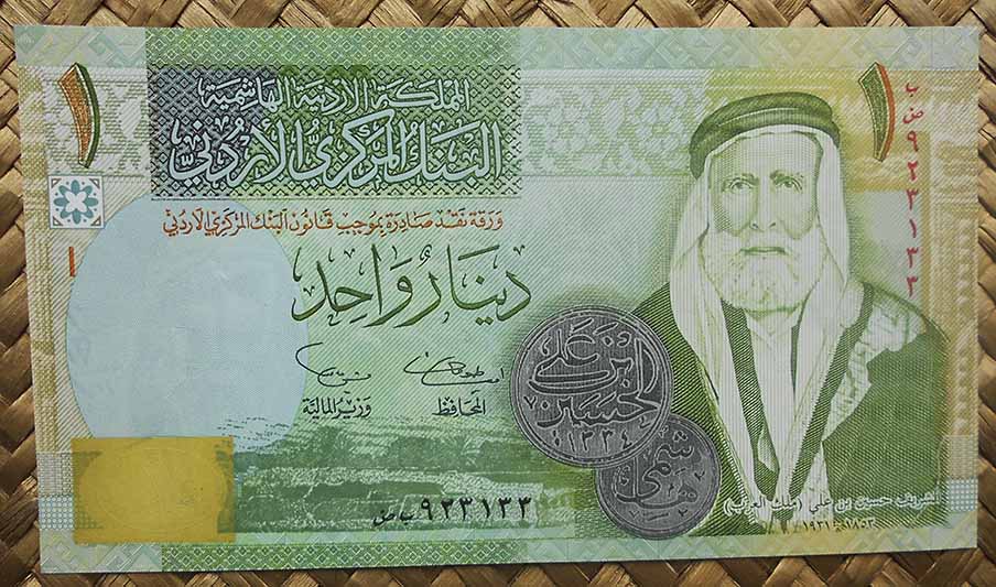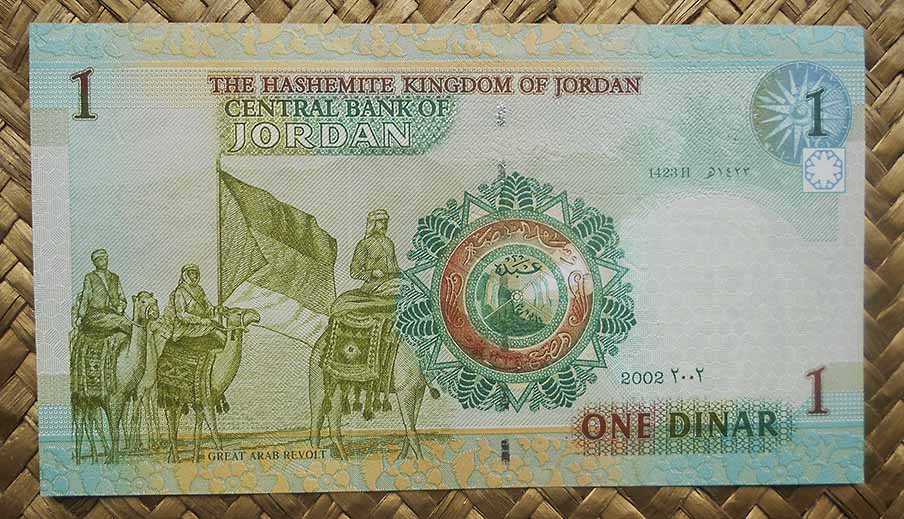 El billete de 1 dinar Jordania de 2002 nos muestra en su anverso a Hussein Bin Ali El-Hashimi, que fuera Rey de Hejaz (1917 – 1924), de fondo un palmeral entre ruinas y a su lado unas monedas de plata acuñadas en Hejaz en los inicios del s. XX. En su reverso vemos árabes sobre camellos portando la bandera de la Gran Revolución árabe (Rebelión árabe de 1916 contra el Imperio Otomano para crear un estado árabe unificado entre Siria y Yemen); en su centro la Medalla de la orden del Renacimiento (Wisam al-Nahda), fundada por el rey Hussein del Hejaz en 1917 para recompensar a los que sirvieron en la guerra de liberación (la orden es un reconocimiento otorgado a los más altos servicios civiles o militares del Reino de Jordania)