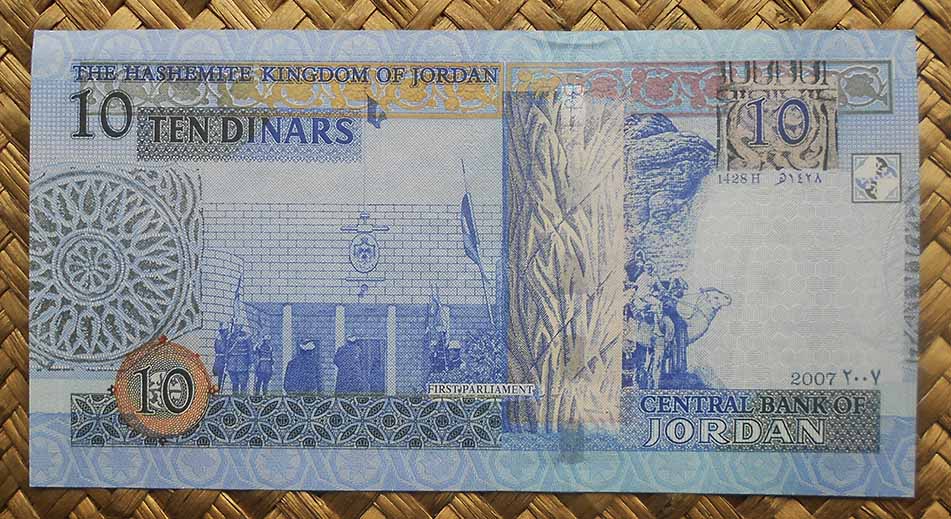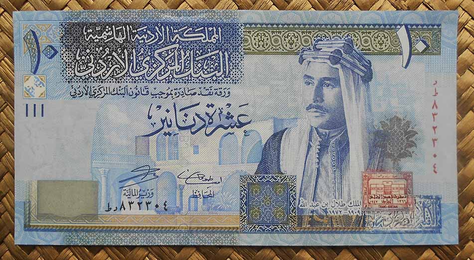El billete de 10 dinares Jordania de 2007 nos muestra en su anverso a Talal ibn Abdala (efímero y enfermizo rey que apenas gobernó un año, 1952, aunque en él ratificó la actual Constitución jordana); junto a él un sello postal de TransJordania, trazos arabescos en una alfombra y una perspectiva de la fachada y patio interior del museo de Umm Qais (antigua ciudad de Gadara, de la Decápolis grecorromana del s. I adC). Su reverso nos ofrece a un lado la fachada de primer Parlamento jordano y un rosetón de Al Qastal, al otro lado, separada por una columna con motivos vegetales, una caravana de camellos en los alrededores de Wadi Rum.