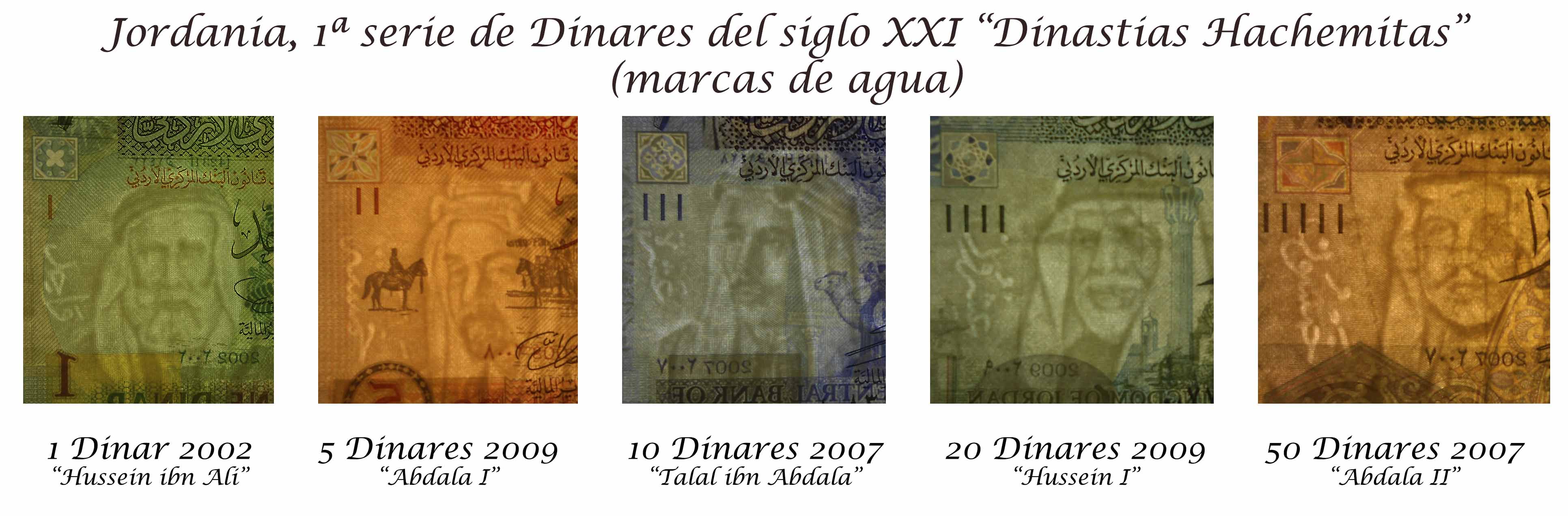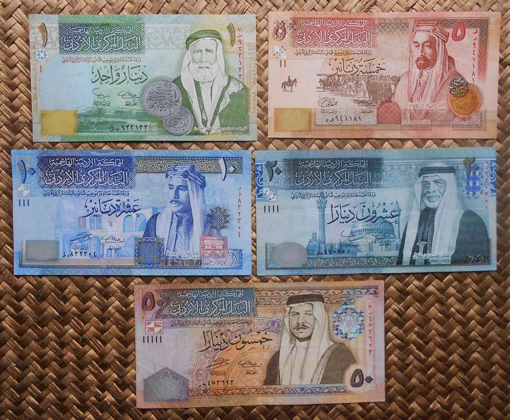 Os muestro una colorista serie de dinares que circulan en este país en los inicios del siglo XXI. Los anversos de los billetes de 1, 5, 10, 20 y 50 dinares nos muestran respectivamente a Hussein ibn Ali (Rey de Hejaz, emir de La Meca y padre de Abdala I), al Rey Abdala I, a Talal ibn Abdala (hijo de Abdala I y padre de Hussein I), al Rey Hussein I y al actual Rey Abdala II (hijo de Hussein I).
