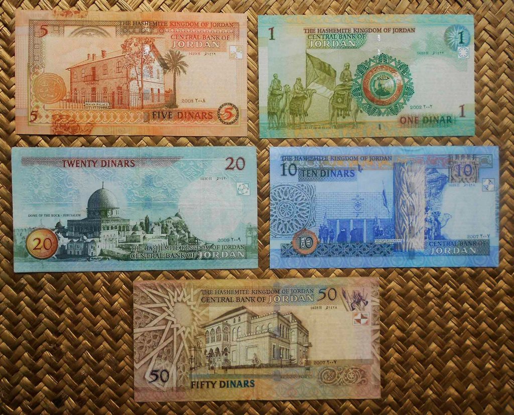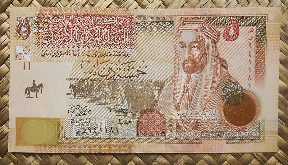 El billete de 5 dinares Jordania de 2009 nos ofrece en su anverso al rey Abdala I (emir de Transjordania entre 1923 y 1946 y rey de Jordania entre 1946 y 1951); a su derecha una moneda de oro de Hejaz y de fondo una parada militar en pleno desierto. Para el reverso el Palacio de Ma’an (modesto edificio que fuera usado por el rey Addala I en el nuevo Reino hachemita de Jordania).