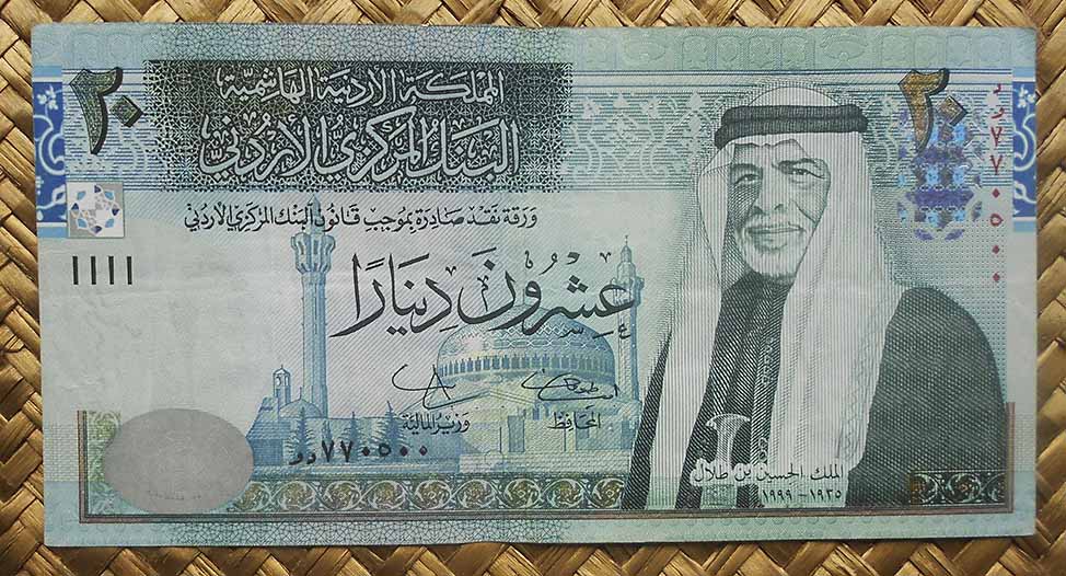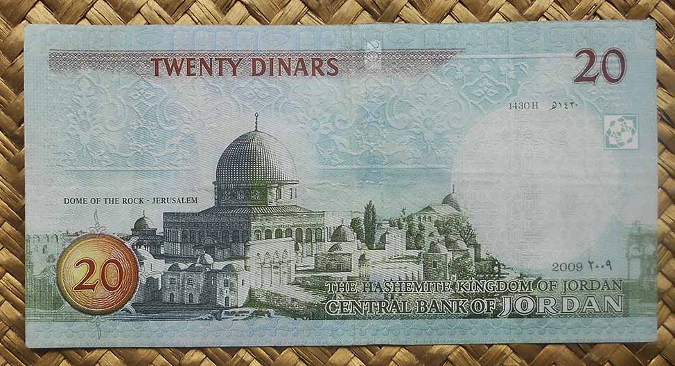 El billete de 20 dinares Jordania de 2009 nos ofrece dos edificaciones de fuera del país. El anverso está presidido por el rey Hussein I (entronizado muy joven, tras el breve reinado de Talal ibd Aldala, que gobernaría el país más de cuatro décadas, hasta 1999). Junto a él vemos la Mezquita de Omar en Jerusalem. En el reverso contemplamos una vista de la Cúpula de la Roca, el santuario sagrado del centro de la explanada de las mezquitas, también en Jerusalem.