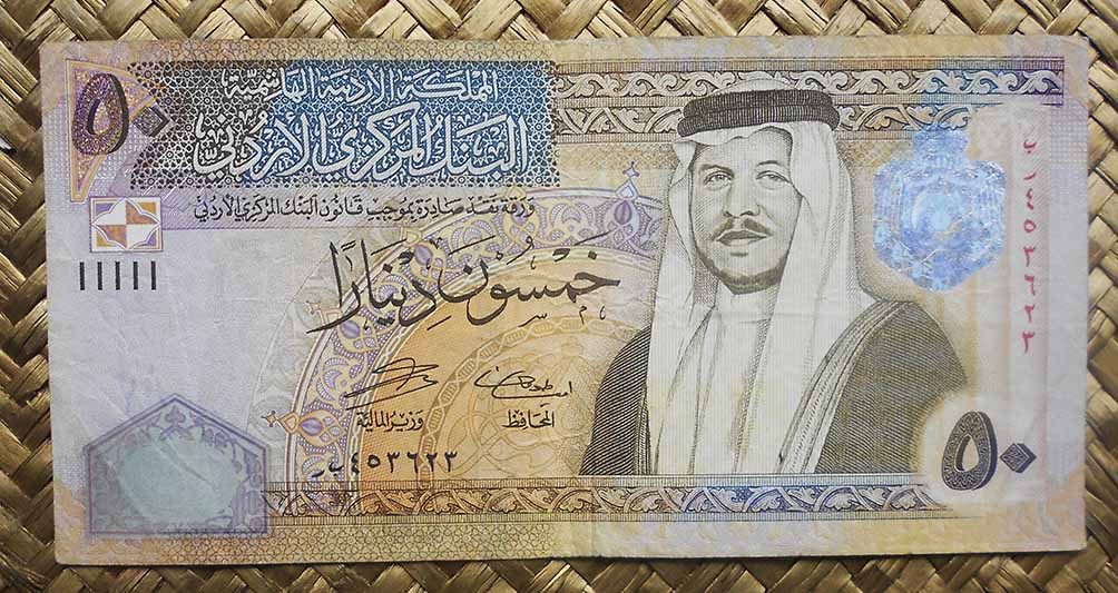 El billete de 50 dinares Jordania de 2007 nos ofrece presidiendo el anverso al actual rey Abdala II (1999- …, hijo de Hussein I). En el reverso contemplamos una vista del Palacio de Raghadan (s. XX) en Amman, a su izquierda parte del rosetón de la mezquita de Al Aqsa y en la esquina superior derecha un lirio negro.