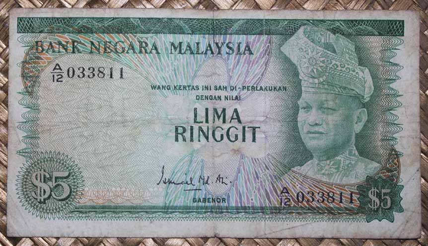 El billete de 5 ringgit de Brunei de 1967 nos ofrece al sultán 28º de la dinastía y su mezquita de la capital en tonos predominantes verdosos, tanto anverso como reverso.