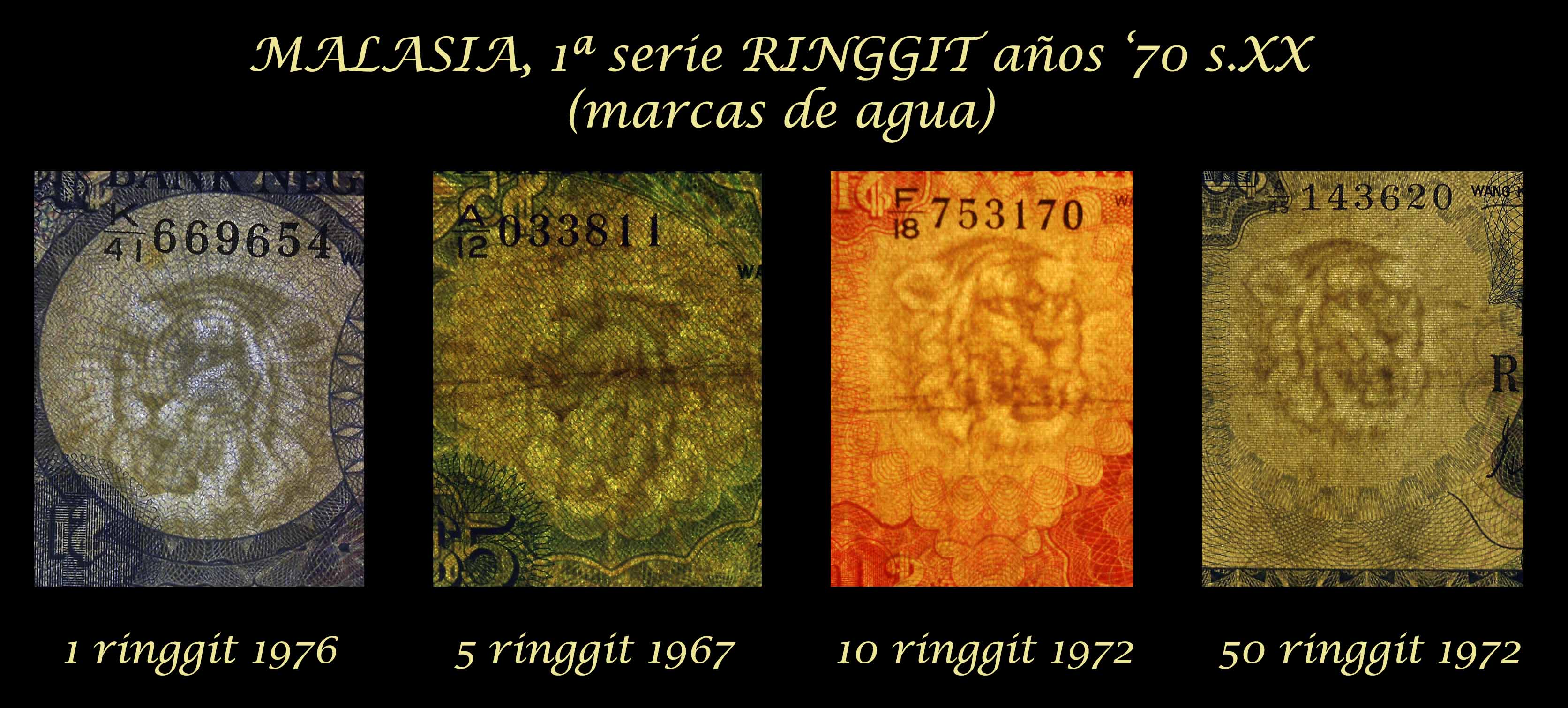 Las marcas de agua de la serie nos muestran la cabeza ladeada del monarca homenajeado con gorra musulmana tipo kufi. También incorporan una banda de seguridad que cruza verticalmente el tercio derecho de los billetes.