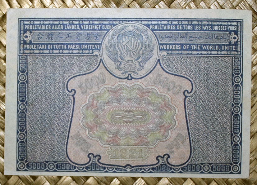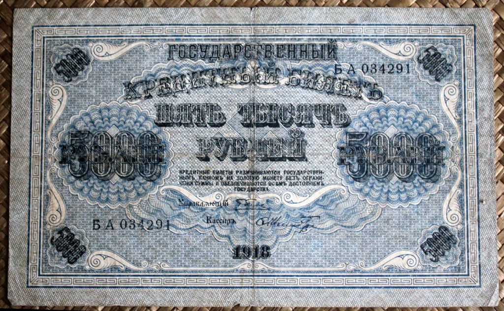 El ejemplar de 5.000 rublos de la RSFSR de 1918 ofrece grabados en gris al anverso y en marrón al reverso; papel de cromaticidad predominante azulada con mezcla de amarillos, rosas y verdes en sus figuras cicloidales.