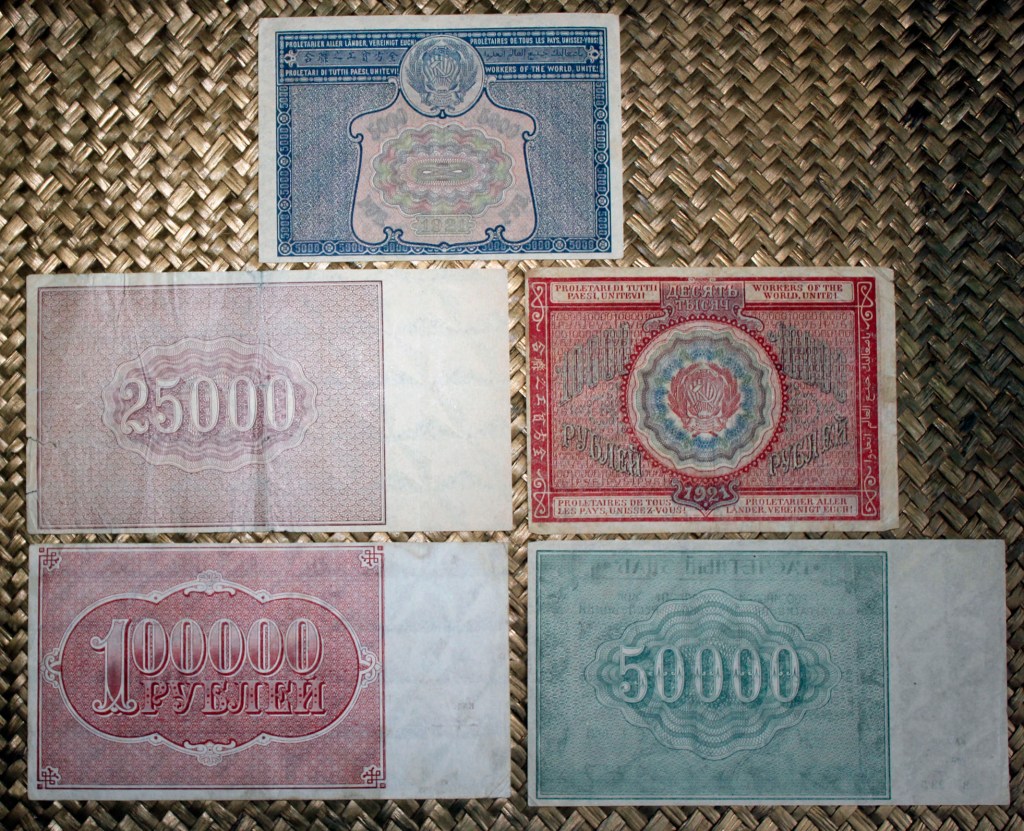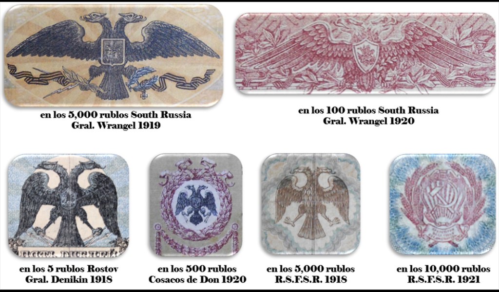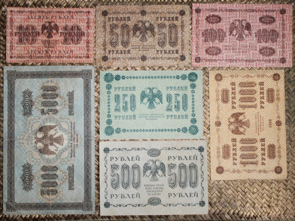 Contemplaremos los billetes de 10 rublos, 50 rublos, 100 rublos, 250 rublos, 500 rublos, 1.000 rublos y 5.000 rublos de la R.S.F.S.R. de 1918.