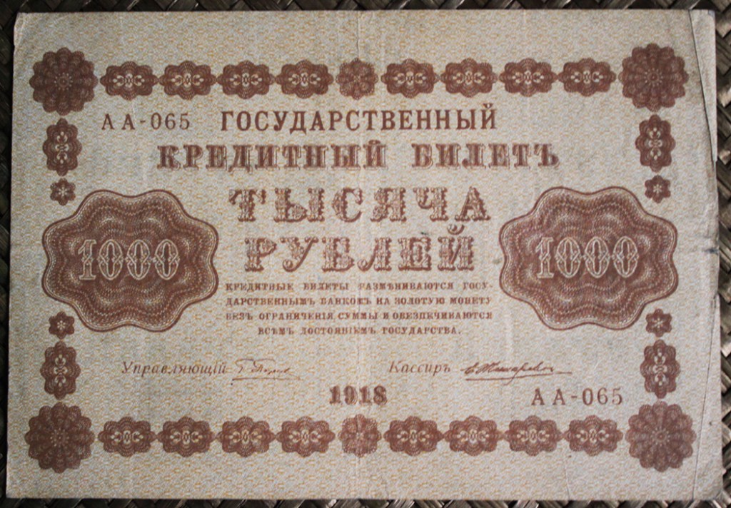 El billete de 1.000 rublos de la RSFSR de 1918 muestra grabados en marrón sobre papel amarillo crema.