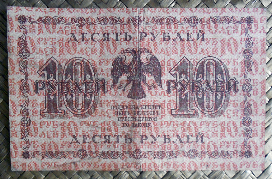 El ejemplar de 10 rublos de la RSFSR de 1918 muestra grabados en rojo al anverso y marrón al reverso sobre papel rosáceo.