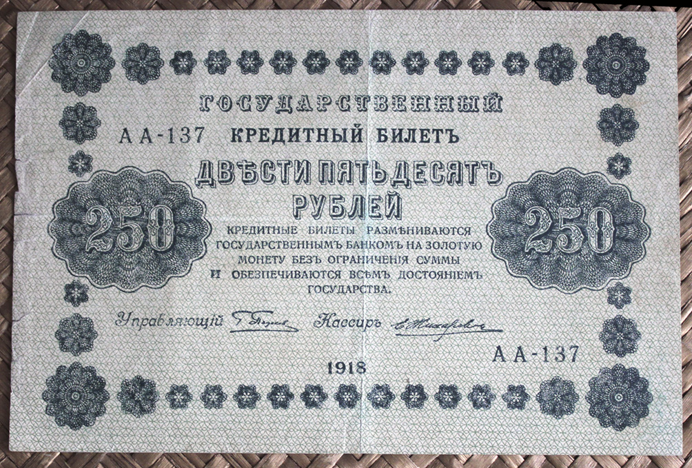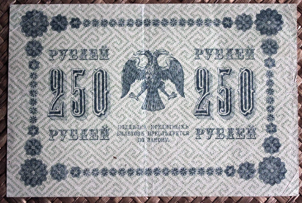 El ejemplar de 250 rublos de la RSFSR de 1918 muestra grabados en verde oscuro sobre papel verde claro.