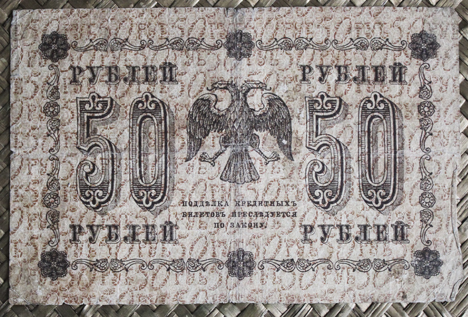 El billete de 50 rublos de la RSFSR de 1918 ofrece grabados en cromaticidad marrón a ambos lados en papel color marrón claro.